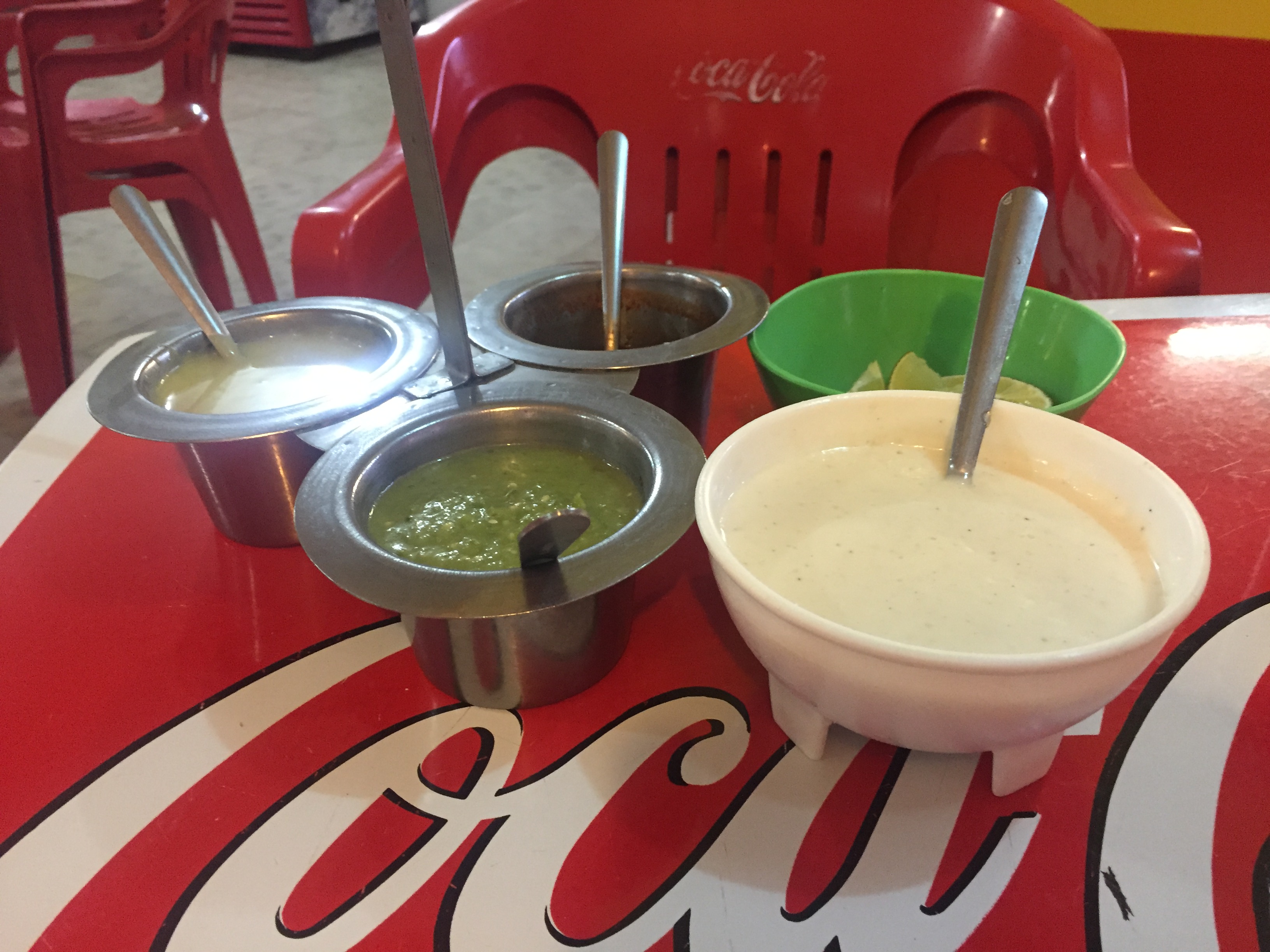 I was surprised that there was a creamy sauce option to put on them. It was a bit like tzatziki, which, now that I think about it, makes sense for these tacos modelled on gyros/donair/shawarma. There was also lime, green and red sauces, and guacamole.