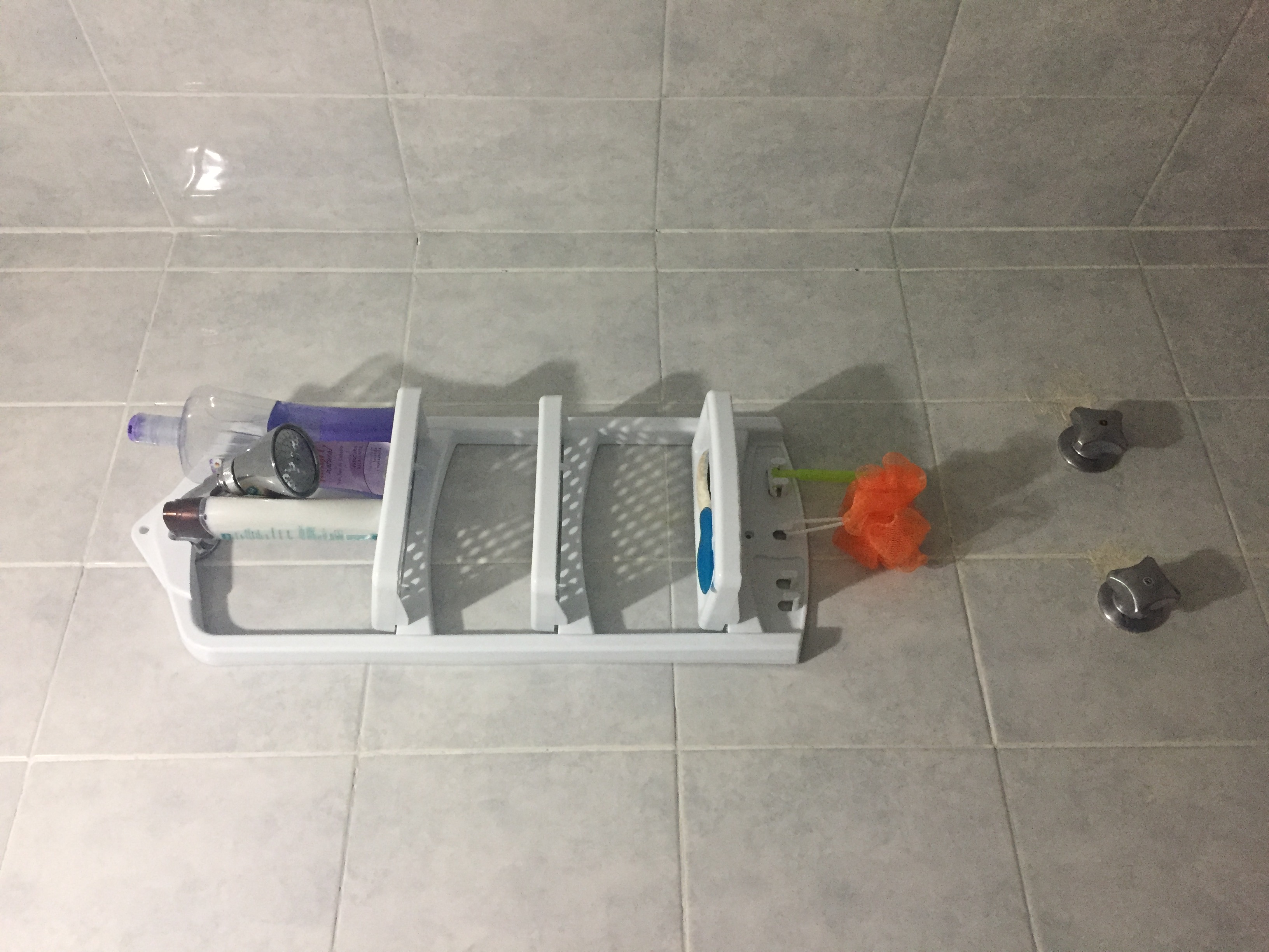 One thing I did find that I am inordinately pleased with is a rack for my shower so I don’t have to store everything on the floor. I found some wire racks to hang from the shower head that were just about useless — only enough room for one bottle. This one had room for at least two bottles and the picture showed a loofah and razor hanging from the bottom section, two things I needed storage for as well (as evidenced by this picture!). There’s also room for my pumice. Best part? This rack was the cheapest option at only $75, $50 less than the wire racks!
