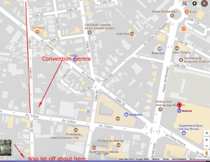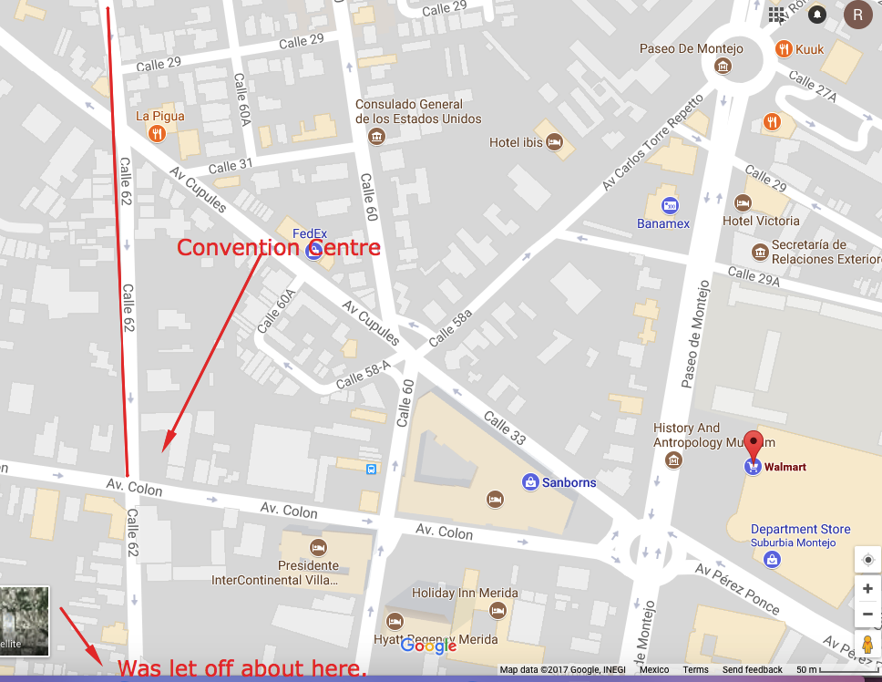 I wanted to get off no further south than the Convention Centre, but kept passing signs saying buses can’t stop on that stretch of 62. When we passed Avenida Colon, I finally got up and asked the driver to please let me off as soon as he could. It ended up being about a block or two further south, which was fine. I doubled back to the Colon and then shot over to Walmart. Crossing Paseo de Montejo at that corner is something I remember from last year and it’s just as much sport this year!