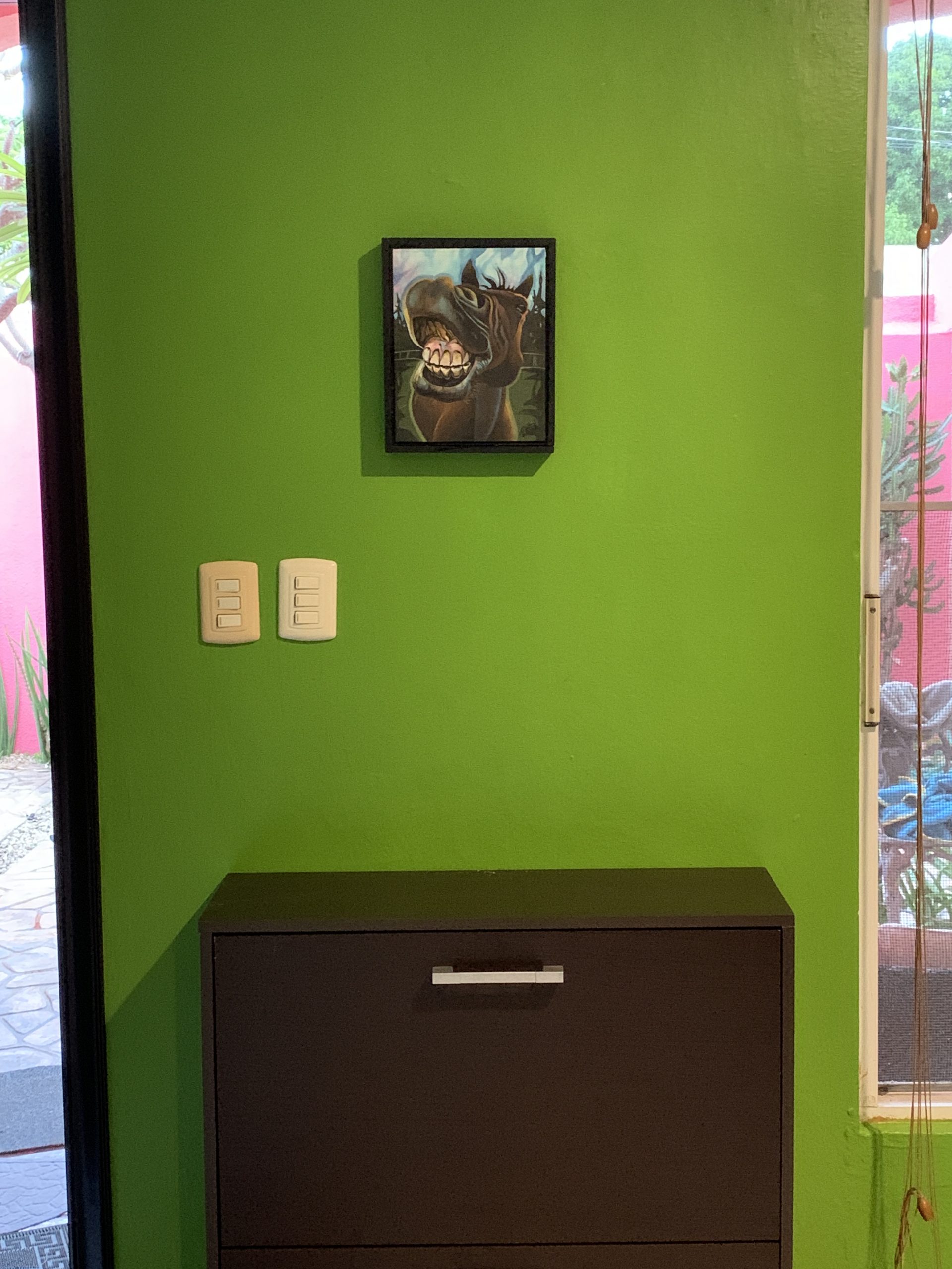 My laughing horse has a new home by the entrance: