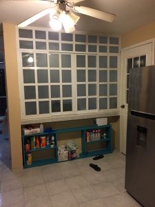 The built-in ceramic countertop area is next on our tour and is in the other room. It is best used for storage because it is against outside walls. If I prepare food on those counters and miss a spot cleaning up, I have ants within minutes. This is why I went with a food prep island, which I’ll get into below. There’s heaps of cabinet space under the counters, but that area is absolutely unusable as it is very smelly and damp. I’ve tried every method I could think of to dry out the space and fresh it up, but it’s proving to be an impossible task. It’s a shame that the kitchen has these cabinets instead of just shelves under a counter, as I’ve seen in a lot of other houses, but it is what it is.