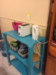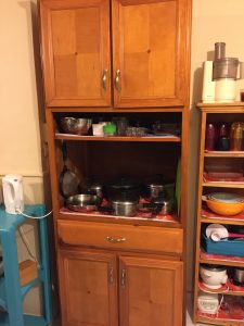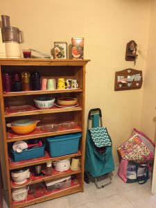 Finally, here’s the cabinet that holds dishes and small appliances. It’s just enough room for what I use regularly. I have a bit of overflow in the dining room buffet. I parked my grocery cart (which was not intentionally turquoise — that’s all they had!) there for now since there’s space for it, it’s out of the way, and it’s too pretty to park out of sight!