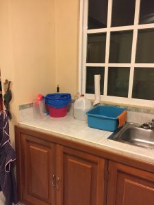 To the left of the sink, I keep my garbage bin, which gets emptied at least once a day. I also keep my dish pan. Dishes are rinsed before going into it. When it’s full, I wash them. This makes it easier to only have one sink basin and keeps me from accumulating too many dirty dishes.