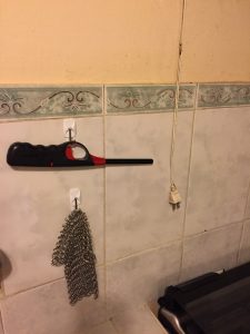 Command Hooks bought locally are on the other side of the stove to hold my BBQ lighter for lighting the oven and my chainmail scrubber for my cast iron cookware.