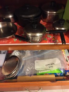 My favourite part of the large cabinet is the drawer that holds plastic bags, wrap, and a variety of tools, including my cheese grater and a mandoline. By the way, I love having my pots laid out like that — no rummaging to find the one I need (or its lid!).