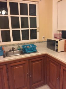 To the right of the sink is the dish rack. It’s more sanitary in this climate to let dishes air dry than to dry them with a cloth and put them away not 100% dry. So the dish rack is always out and usually full since I cook and wash dishes throughout the day.