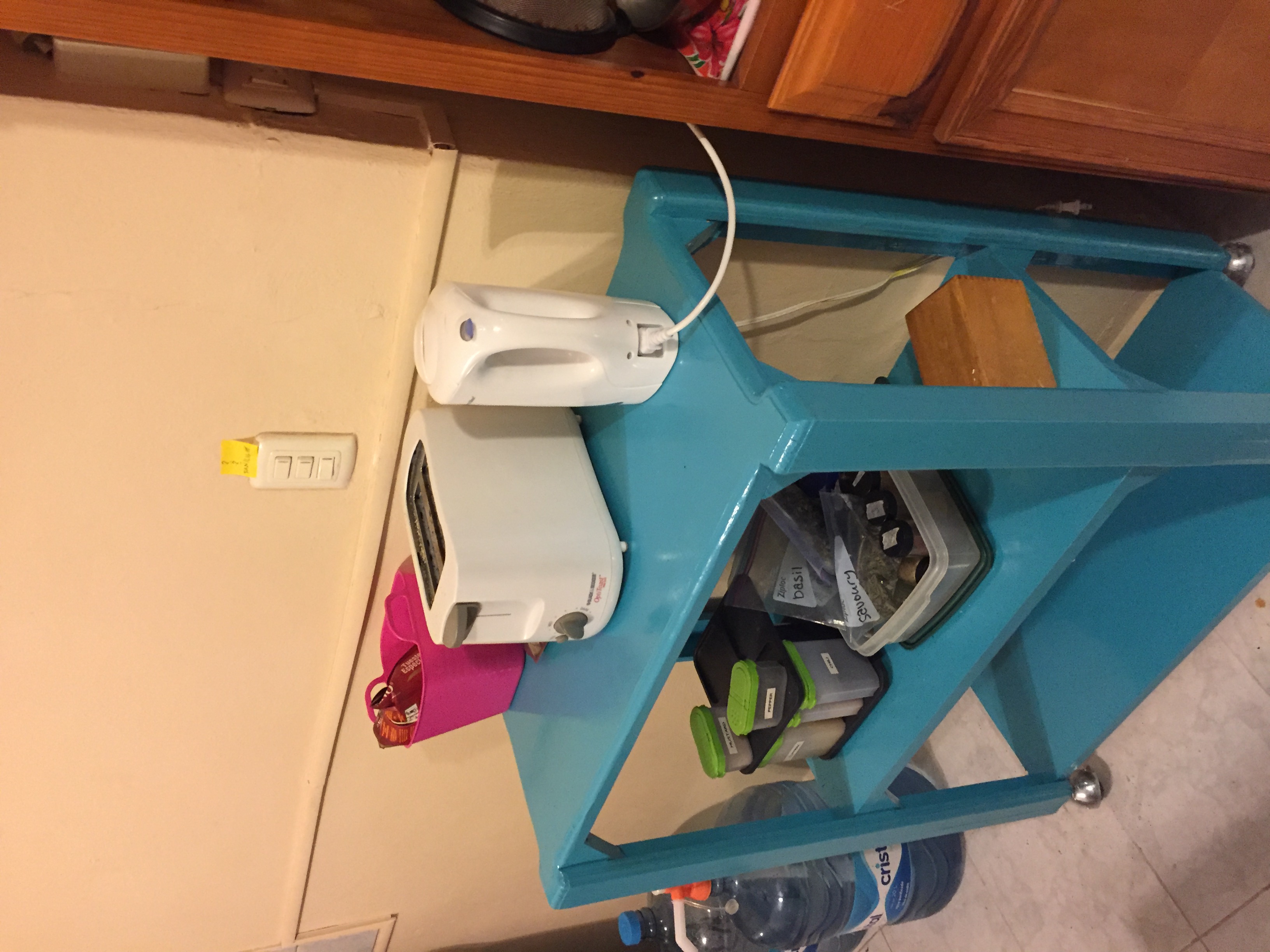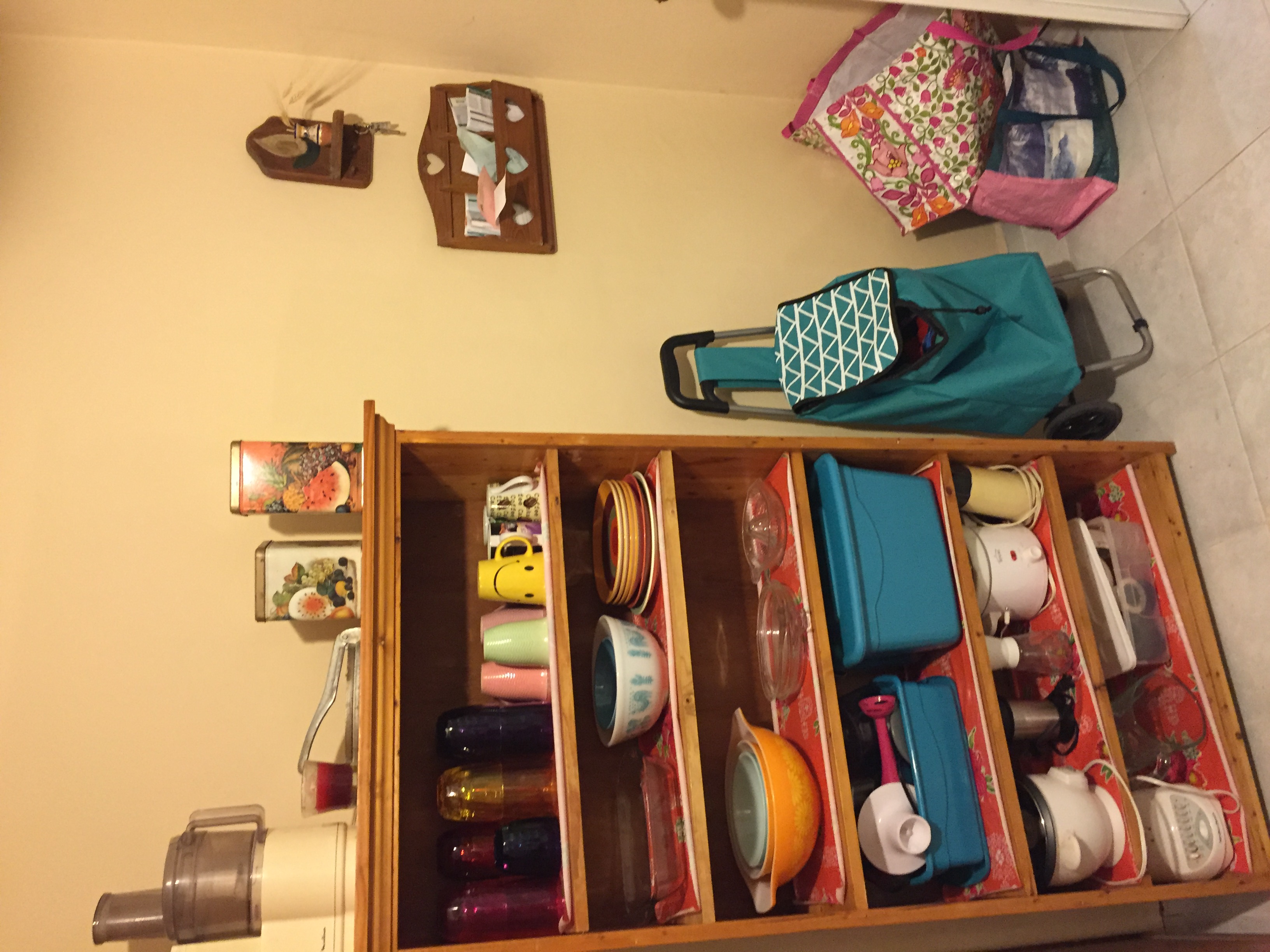 Finally, here’s the cabinet that holds dishes and small appliances. It’s just enough room for what I use regularly. I have a bit of overflow in the dining room buffet. I parked my grocery cart (which was not intentionally turquoise — that’s all they had!) there for now since there’s space for it, it’s out of the way, and it’s too pretty to park out of sight!