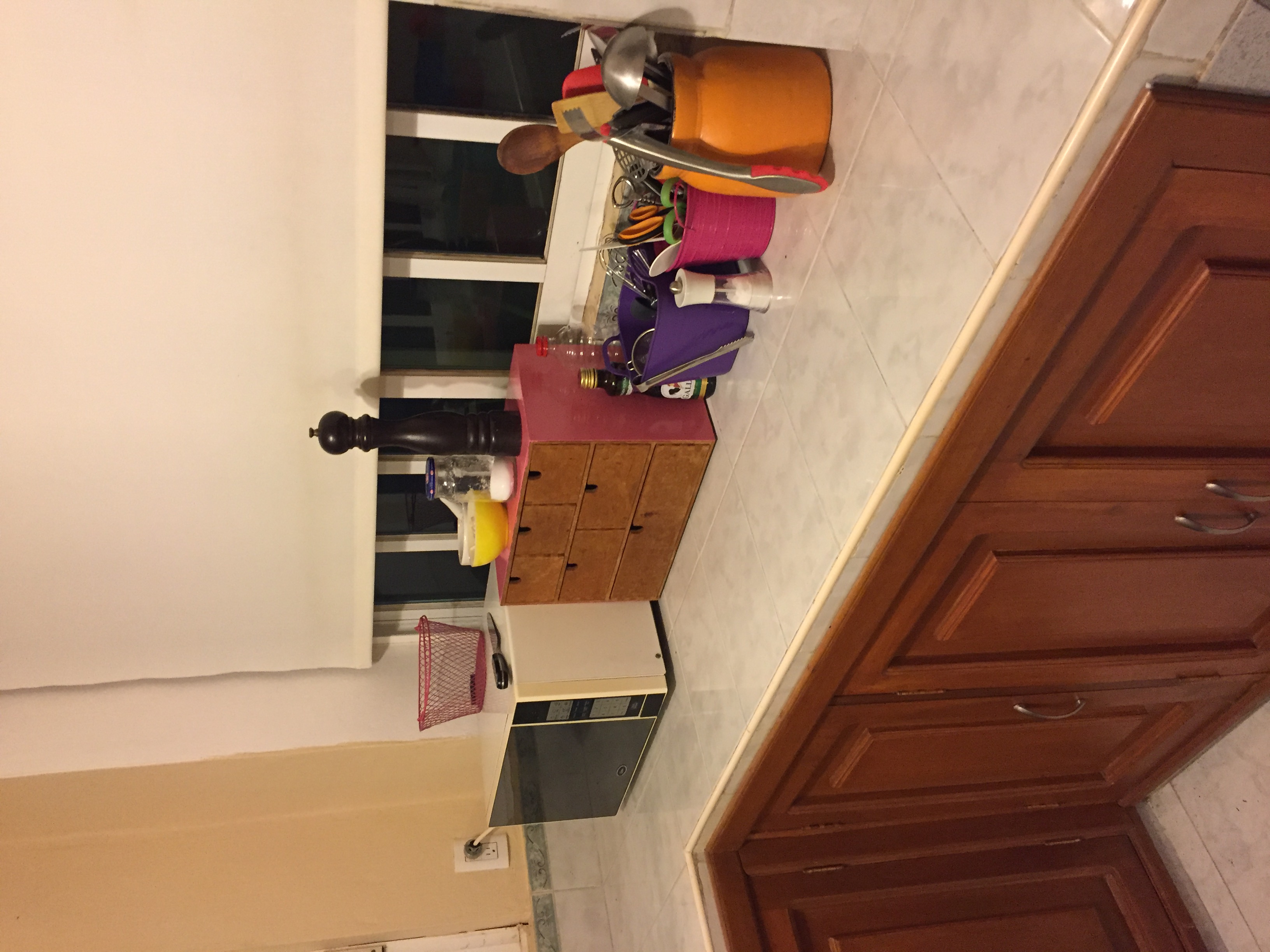 Across from that is the microwave. There is nowhere else in the kitchen to plug it in, so it has to live there. Next to the microwave is my cubbies with utensils. You’ll notice it’s blushing now. π That project isn’t done! Then, I have a series of containers holding cooking utensils. I only had the pink bucket and orange crock for years, but found adorable square buckets at Bodega and decide to use one to expand my storage a tad.