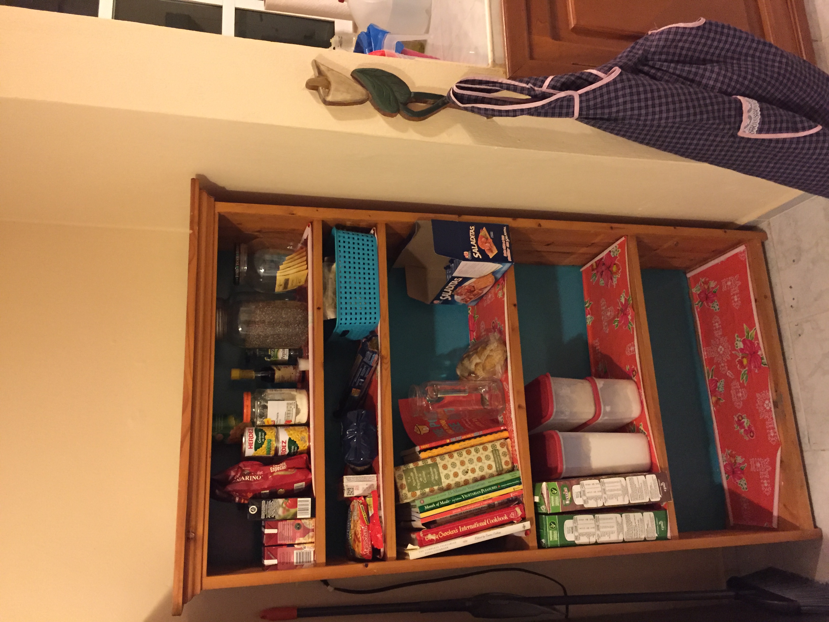 Next is my pantry bookcase. I’m still in the process of building up my pantry, so this and the turquoise shelving unit have so far been plenty of space. The hook on the bump-out was there when I moved in and is the perfect spot for my apron.