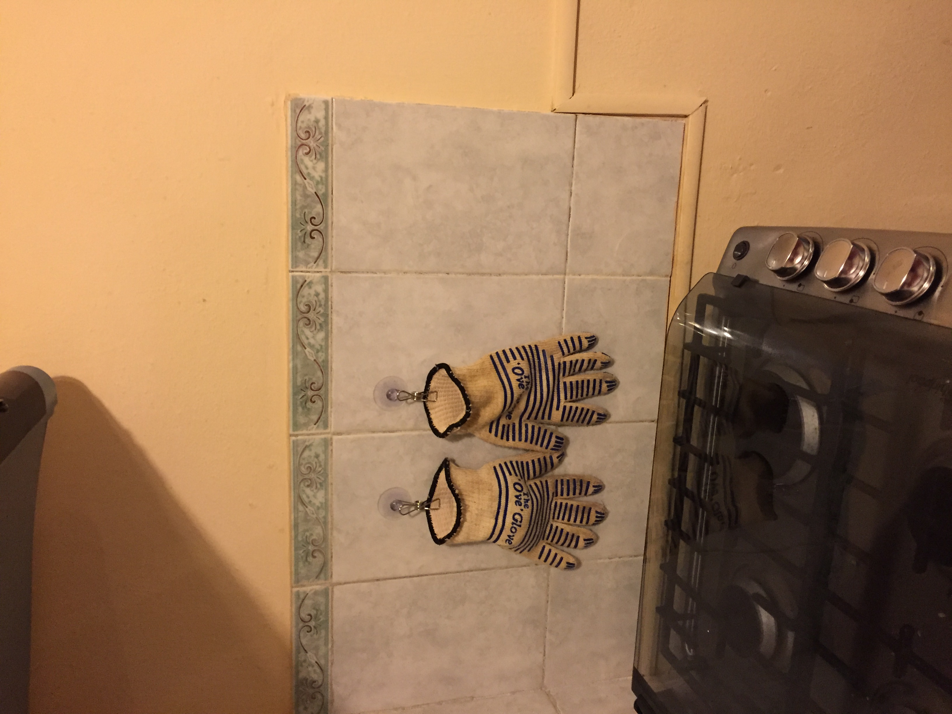 One thing I never figured out in Miranda was the perfect place to put my Ove Gloves, the only oven mitts that can handle hot cast iron. I do wish they were a tad easier on the eyes, but I’d rather burn my eyes than my hands! πΒ I did some research and found out that 3M makes Command Hooks with a clip, but couldn’t find them locally or on Amazon to ship toΒ Mexico. So I instead found suction cup clips that actually seem better than the Command Hook clips. They are large and sturdy and I’m so far very happy with them.