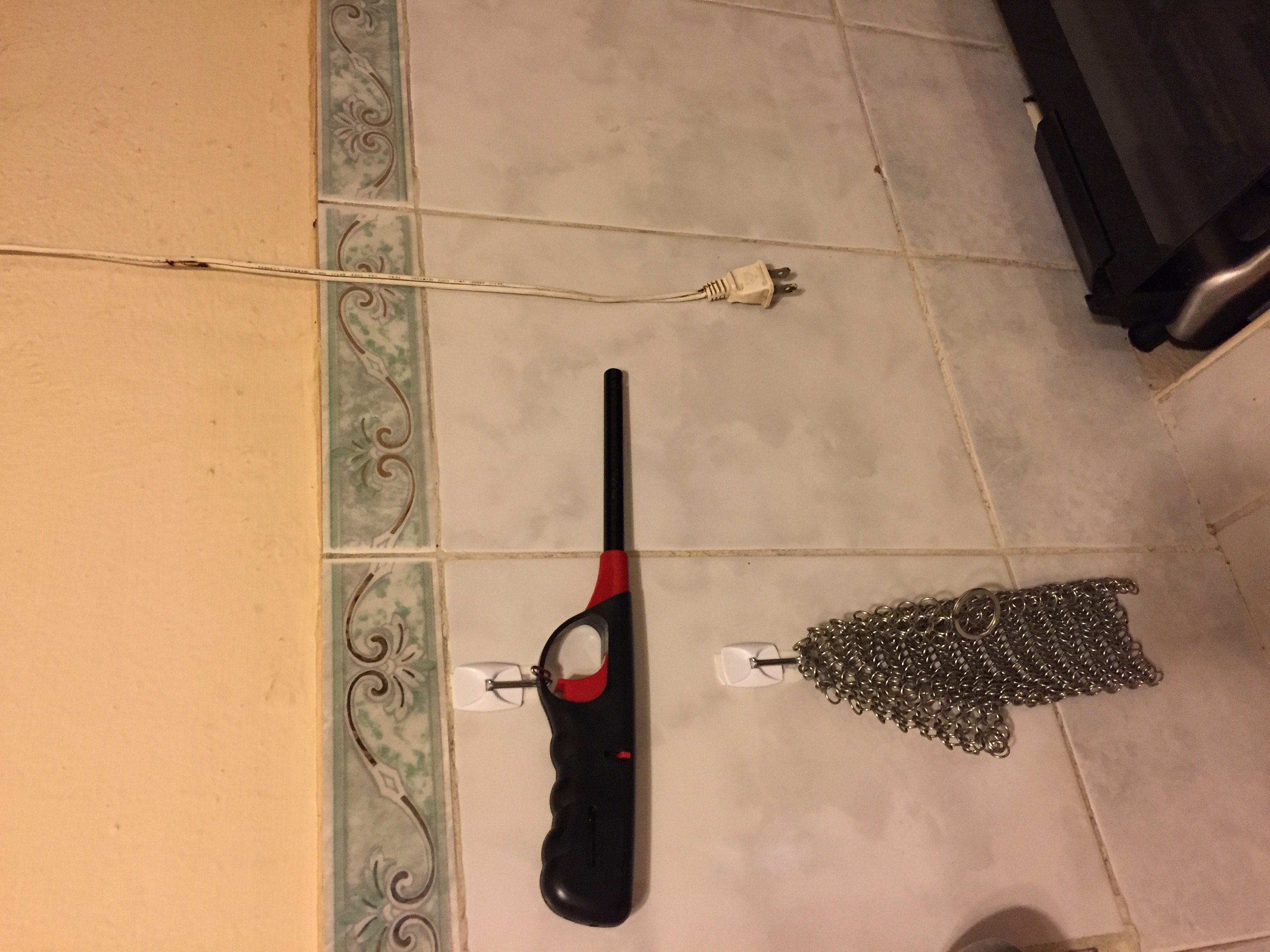 Command Hooks bought locally are on the other side of the stove to hold my BBQ lighter for lighting the oven and my chainmail scrubber for my cast iron cookware.
