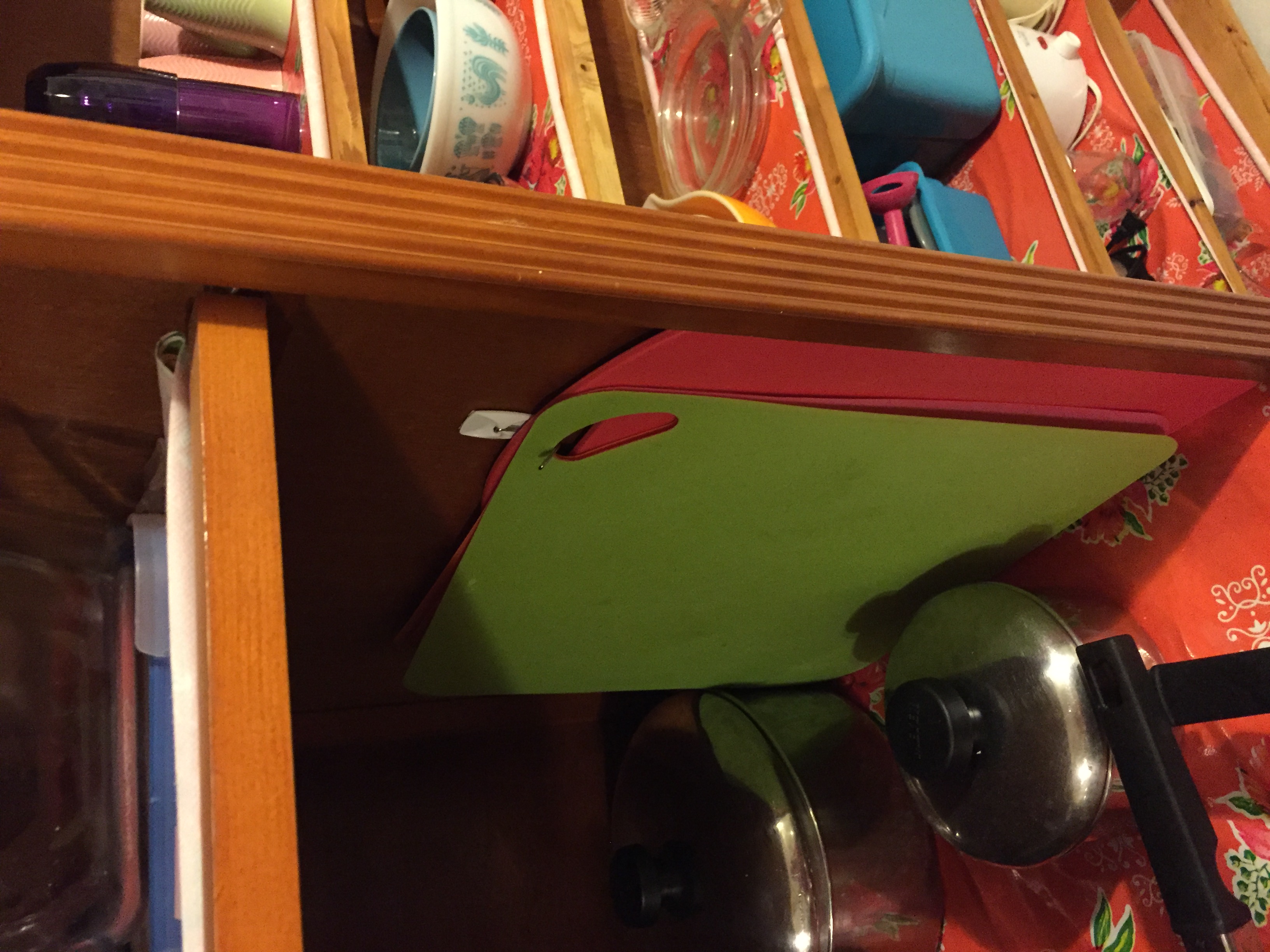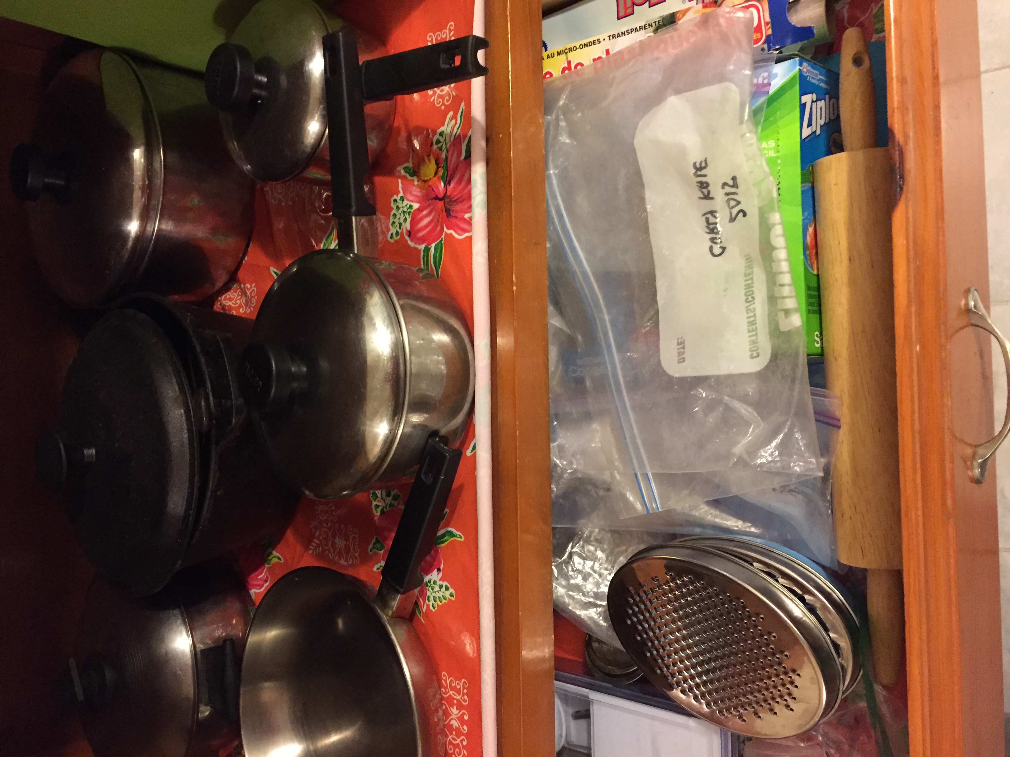 My favourite part of the large cabinet is the drawer that holds plastic bags, wrap, and a variety of tools, including my cheese grater and a mandoline. By the way, I love having my pots laid out like that — no rummaging to find the one I need (or its lid!).