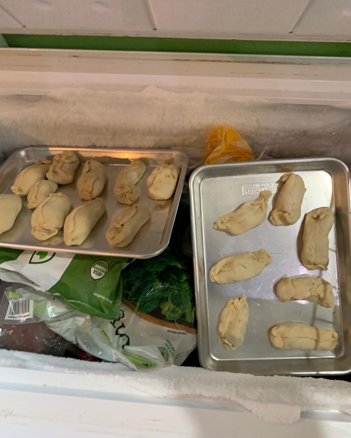 I still have enough for five meals waiting in the freezer. I freeze them like this on trays and then bag them. This way, they don’t stick together.