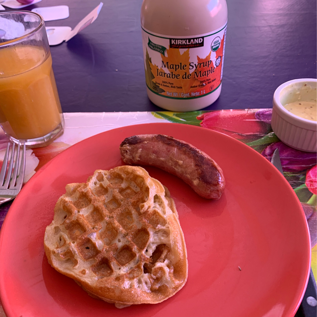About halfway through my work day, I came down to make a delicious brunch. The waffles are misshapen due to using an egg replacer and too much butter, but were delicious! The sausage is Argentinian-style chorizo sold by a gentleman who pedals around the neighbourhood on Wednesdays selling fresh cheeses and sausages out of a cooler. The orange juice is from a fellow on my walk home from Pilates who runs a small fruit stand out of his house and can be seen sitting in front of the house juicing impossibly delicious oranges all morning. I’ve been wanting to make waffles for ages to have as a post-workout evening treat, so I now have six waiting in the freezer.