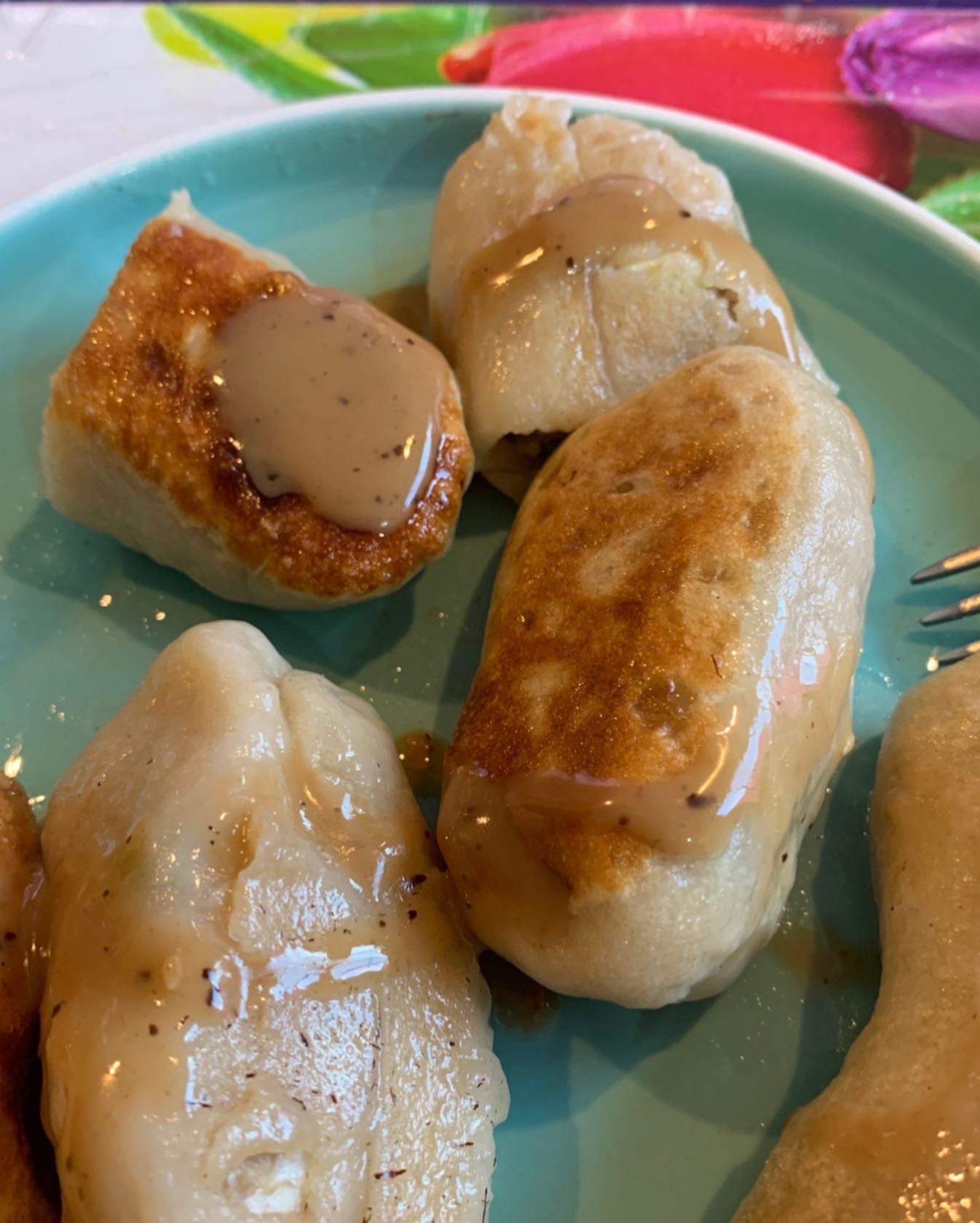 As expected, my gyoza turned out super doughy, but still delicious! I usually make my own dipping sauce, but I had a sesame ginger commercial dressing in the fridge that I knew would be perfect with them. Yum, so good!