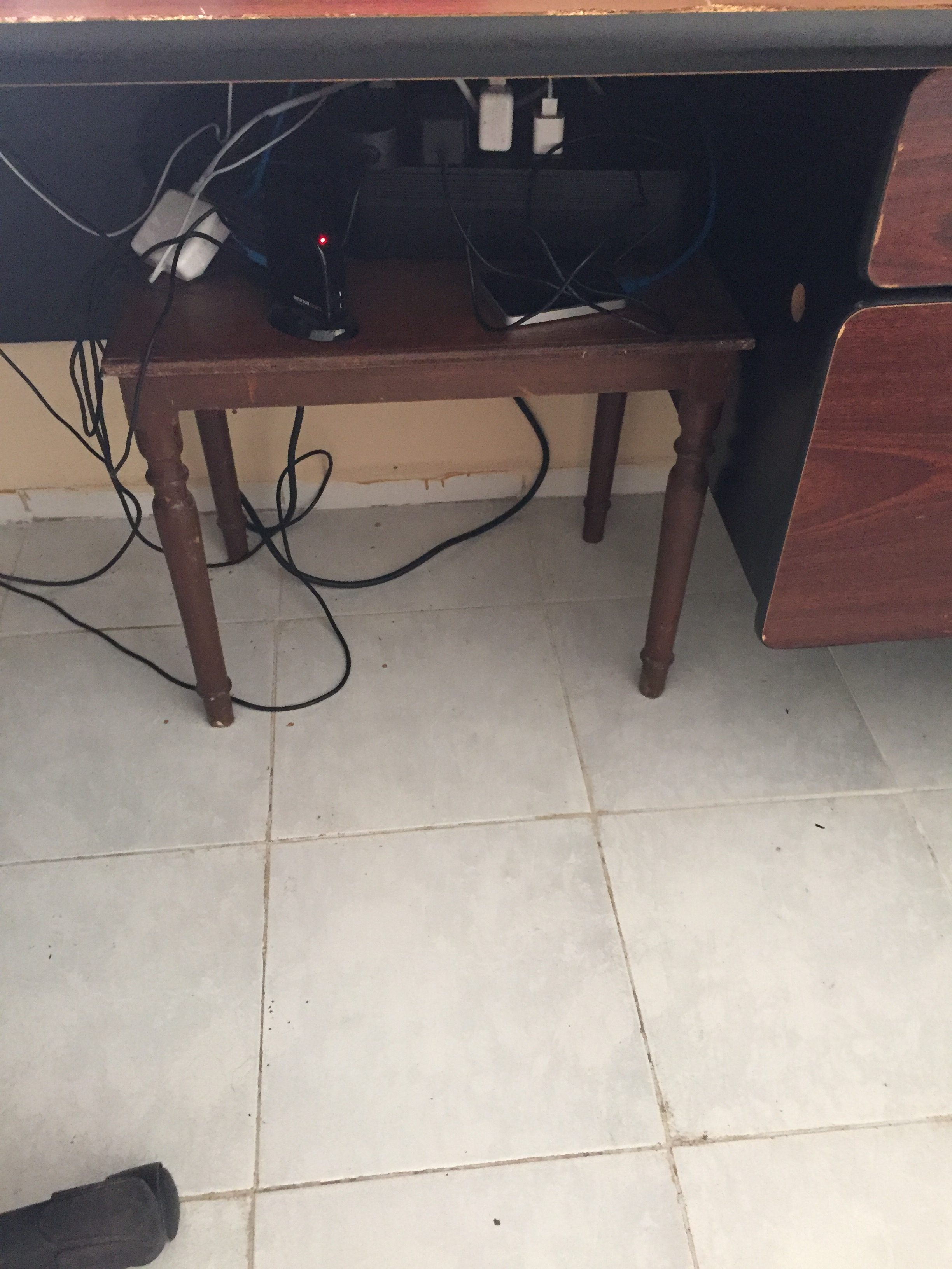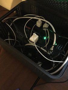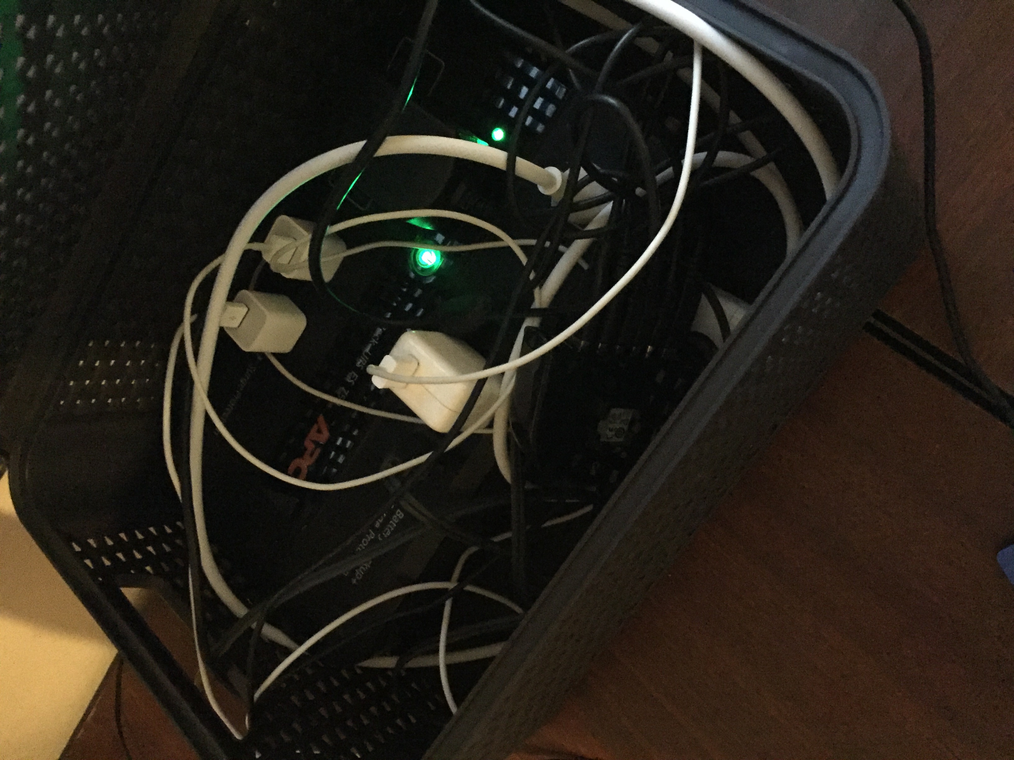 I was tired of the dust and the mess and hitting my shins and having to get on my hands and knees to access my iOS device cables. While Googling cable management ideas, I found the perfect solution, a cable organisation box (example here). It’s simply a box into which you put your surge protector and then there are slots for feeding your cables out of the box. This way, everything is contained, easily accessible, and very neat. The problem is I use a ginormous uninterrupted power supply and I could not find a commercial cable box that could fit it.