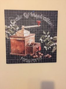 I don’t like the background of this image, but I love the water colour coffee grinder. At 95 pesos, I couldn’t leave this behind! I put it up in my kitchen.