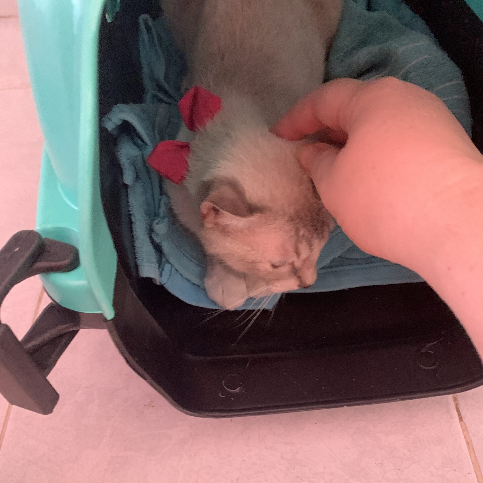 Alma was very quiet on the ride home. I had set up the “bonus” room for her, so when we got in, I opened her carrier, with the intention of letting her come out and explore at her own pace. She did lean into a quick scritch, so that was very promising!