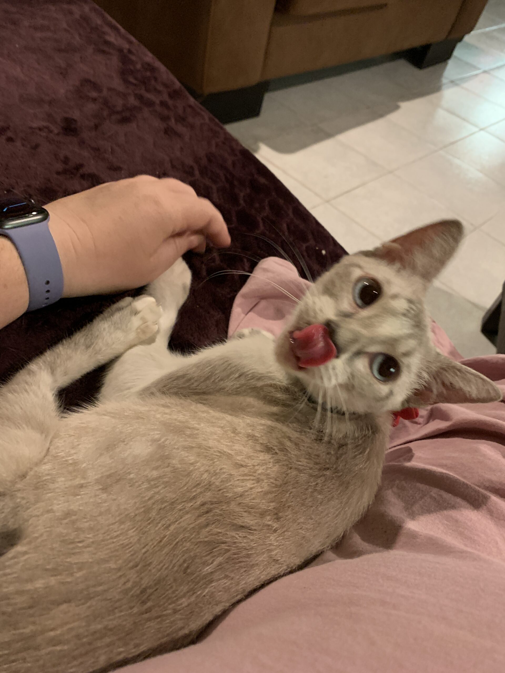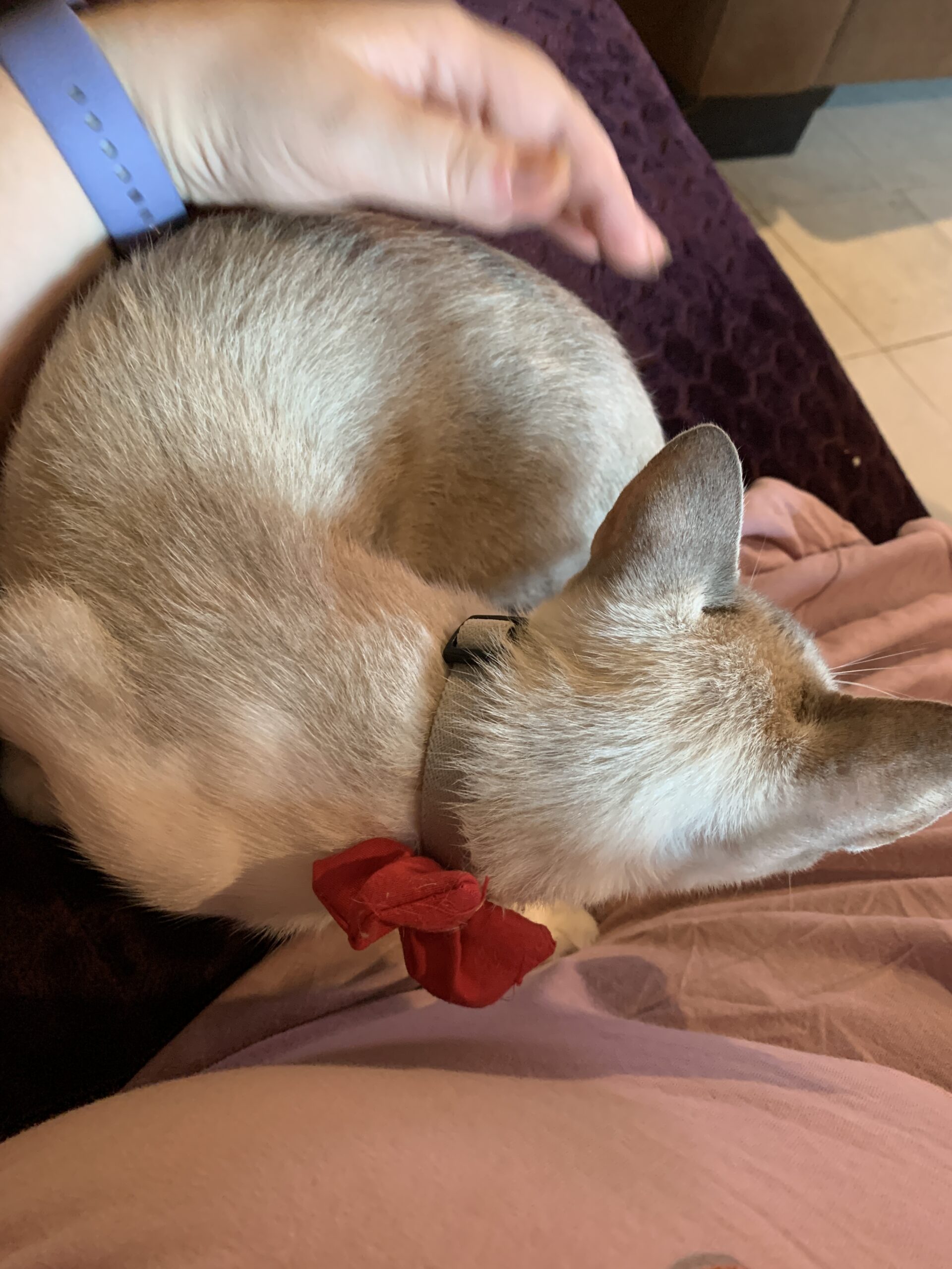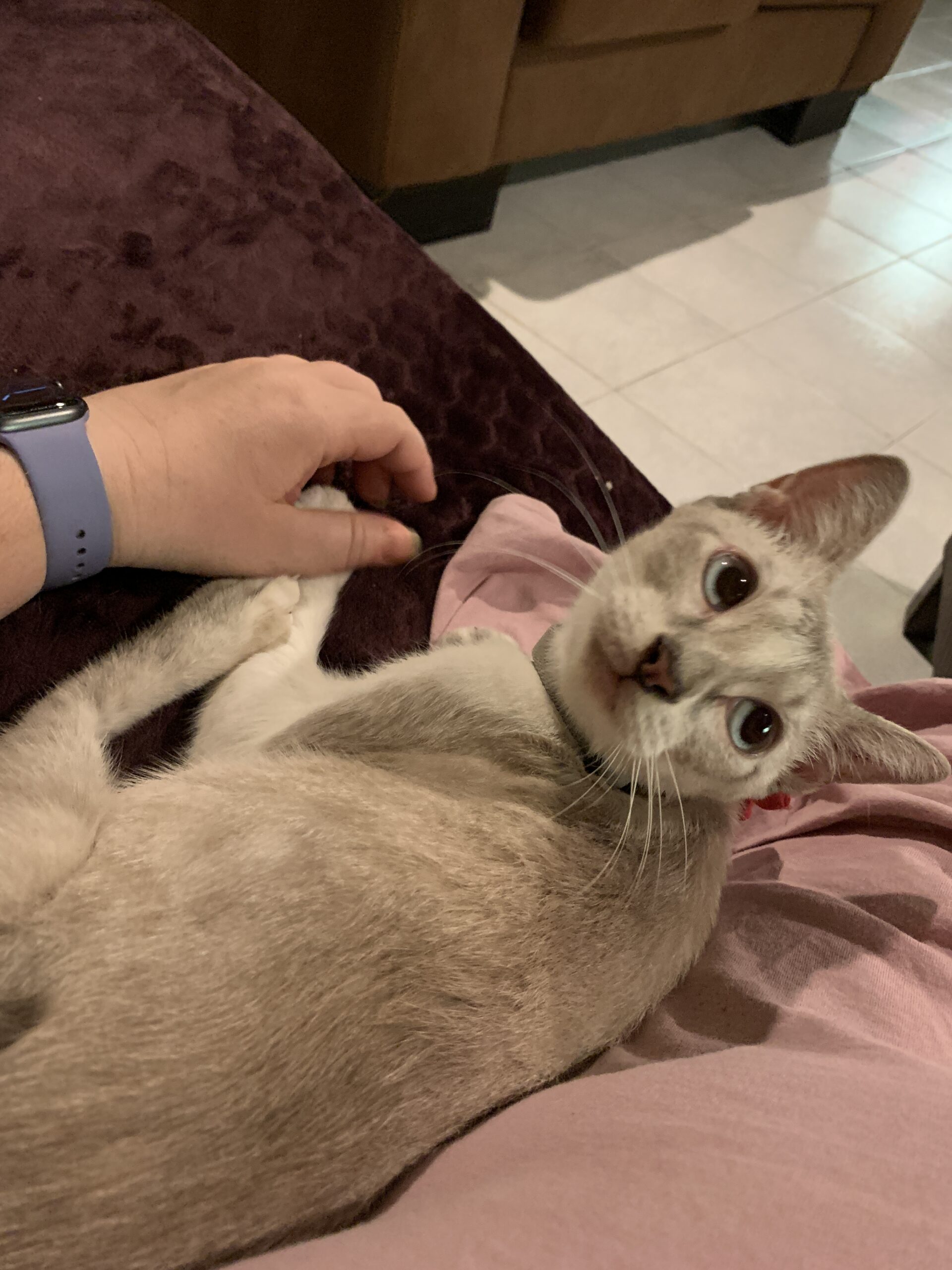 This morning, I found her under the treadmill. Soon as she saw me, she yelled at me and then she went to hide behind the blinds in the window. I gave her some time and then tried for a repeat of last night. She was again very happy to come and cuddle while I had my coffee.