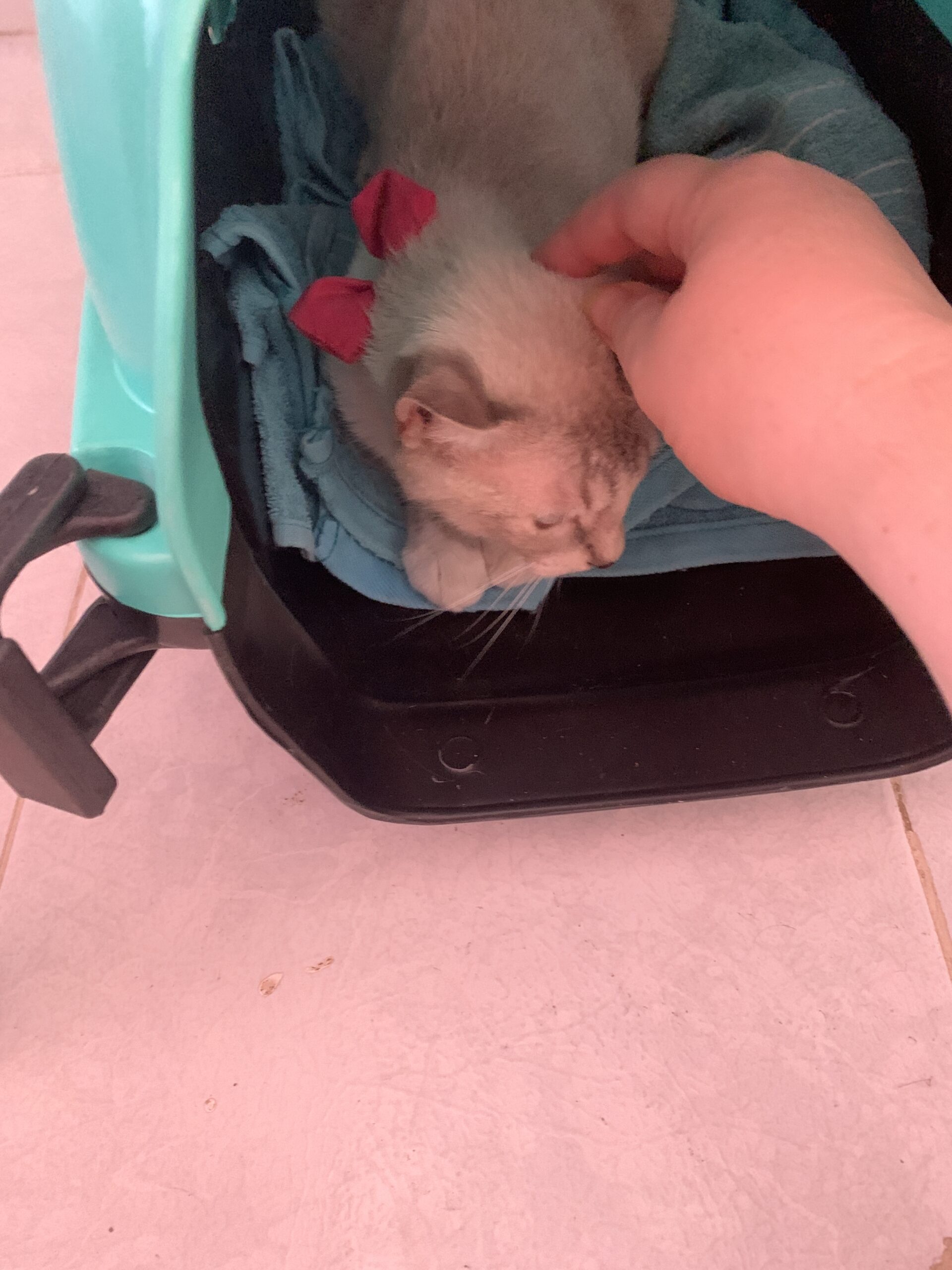 Alma was very quiet on the ride home. I had set up the “bonus” room for her, so when we got in, I opened her carrier, with the intention of letting her come out and explore at her own pace. She did lean into a quick scritch, so that was very promising!