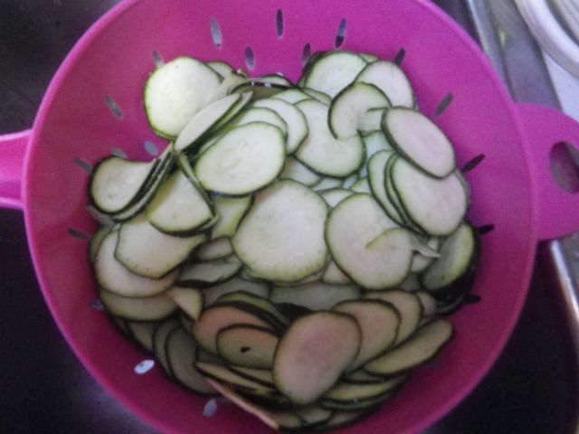Today, it was about five hours, which is pretty average. I’ve done them less and they were still good, but a bit soggier. Longer doesn’t hurt them. I drain in the sink for an hour or two, then move to the fridge. The important thing is to have the colander above the sink/bowl so that the zucchini isn’t resting in the juice.