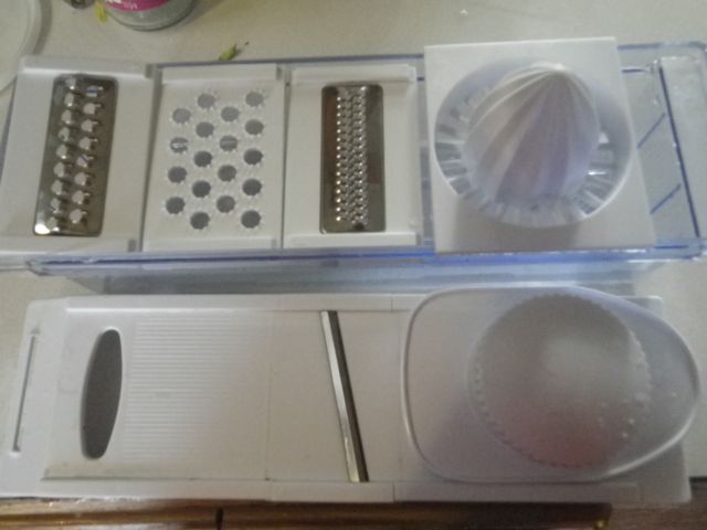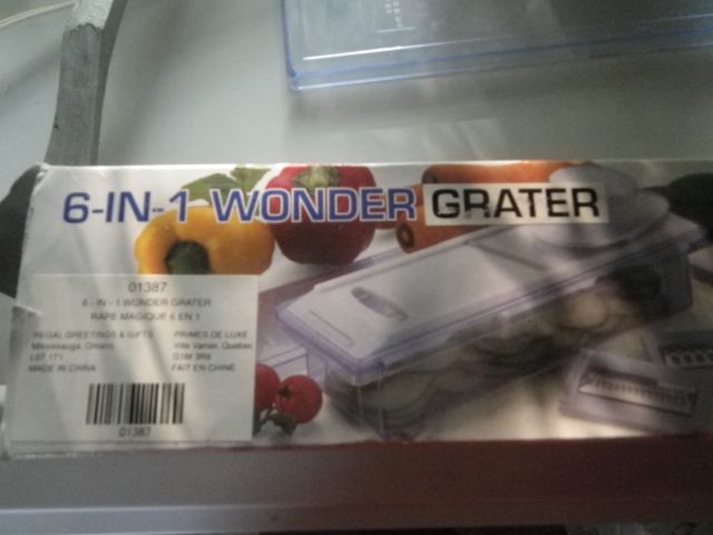 It’s a mini mandoline with all the attachments! The box was sealed with lots of tape and marked just $2, so I bought it without checking out the contents. Those of you on Facebook know that when I finally opened the box, I found $7.50 in it, as well as $0.10 worth of Canadian Tire money!!!!!!!!!!