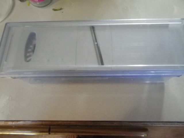 This mandoline comes from Regal, a catalogue company like Avon. My friend Donna is a Regal rep, so I’ve seen some of their products and know that they are good quality. In fact, she got me a nut chopper from them several years ago that is still working very well despite all the paces I’ve put it through. So I knew that I’d scored a mandoline that was going to serve me very well for a long time. I should add that it has clearly never been used!!!
