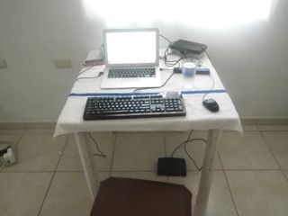 The next setup was much better, but did not make me feel professional and therefore was not conducive to productivity. I dragged an end table into the living room from the second bedroom and set up my computer on it. I put the pedal inside the table so that it could be at a comfortable distance for my feet and sat on the couch. This was actually not horrible, but the computer screen was far away and the setup just felt messy and, again, unprofessional.