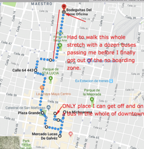 The bag was a bit heavy, but small, so I decided that I would bus home instead of taking an Uber. I went to Calle 60, figuring that, surely, I was north enough to be out of the absolutely stupidly huge “no pickup or drop off zone” downtown since I have been dropped at around the height before. Nope. At least a dozen buses passed me as I trudged along until one was finally able to stop. Mérida is working on both the bus system and traffic congestion in the downtown core. I’m not the only resident who has chimed in to say that prioritising cars in centro is not the right solution to either problem.