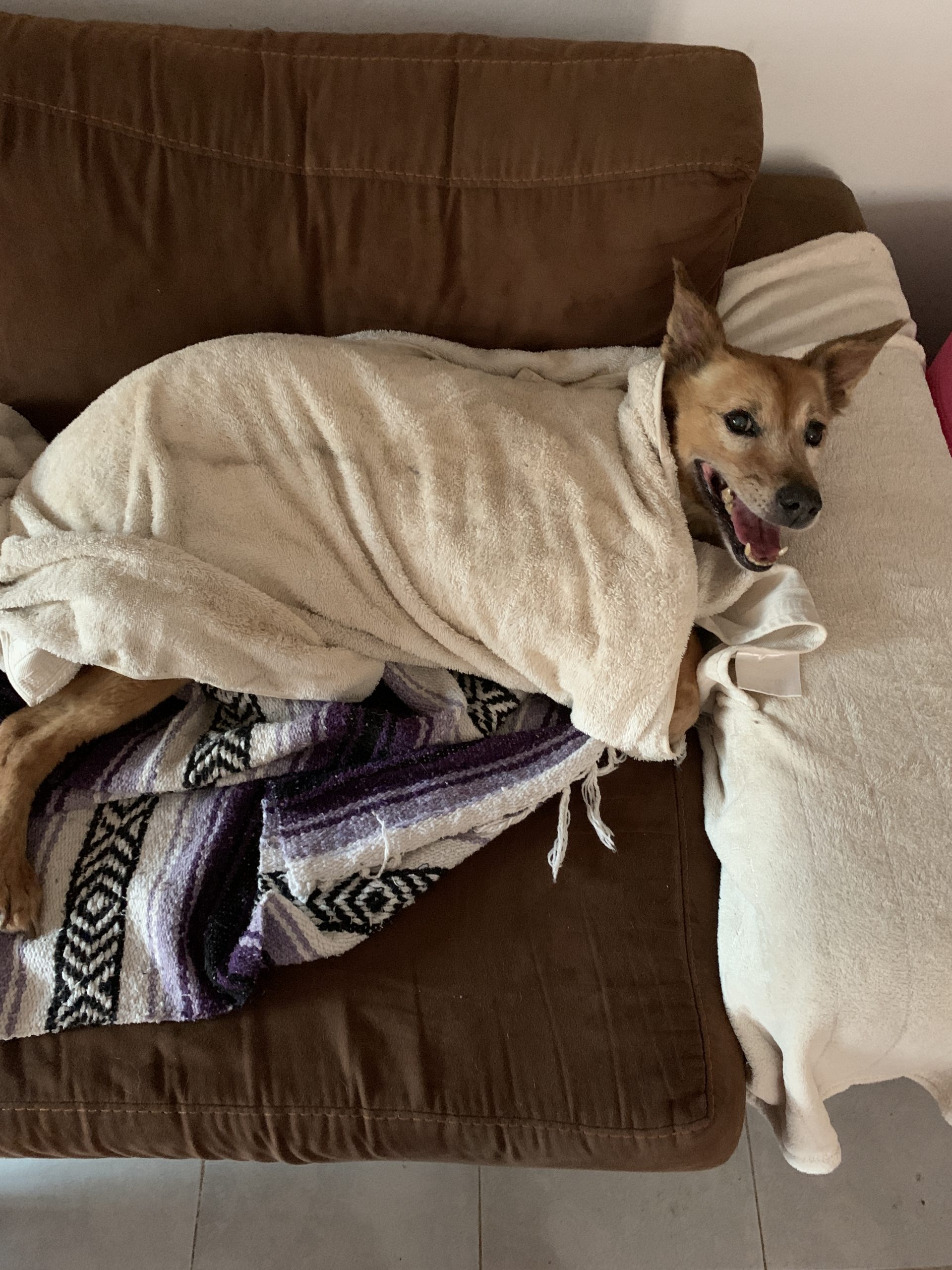 Last night was the usual. I wanted to keep her in, but she wanted out. I expected her to be a mess this morning, but found her in her dryish bed perfectly clean. I guess she’s as over this weather as humans are!