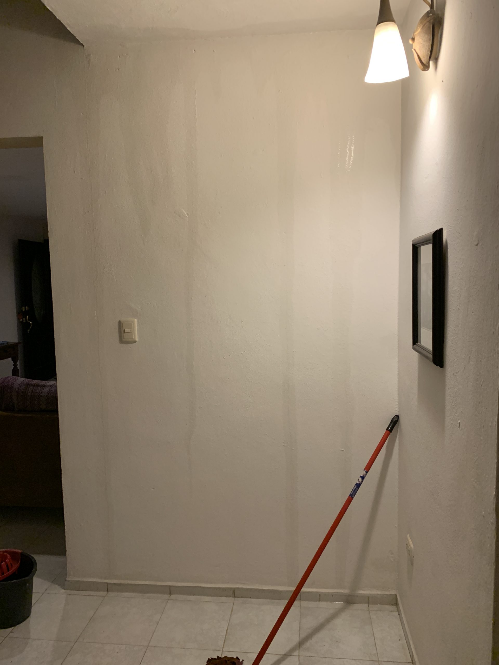 I will spare you the pictures of all the damp spots, but will share some of the downstairs landing, which has been the most badly affected. Water has been coming in at the second floor from the new living room roof they put in. Imagine that roof is the same height as the floor up there, separated only by a wall that was never meant to be an exterior wall (they intended to build a room over the living room, so they just built a temporary closure from the top landing to that space). So the water is leaking in from the bottom of that wall. And then, instead of pooling on the second floor landing floor, it’s just soaking through and coming down the wall.