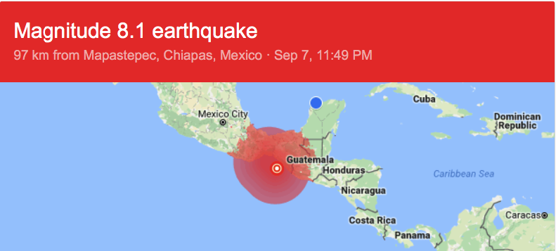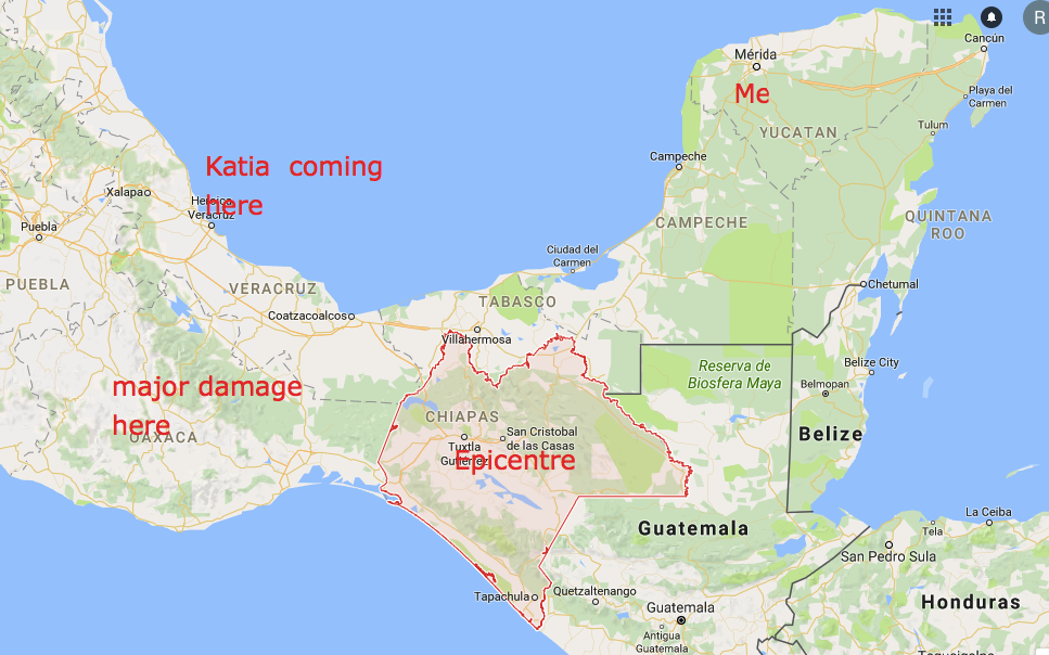 Last night, I was woken around 11:45 by what could be nothing else but an earthquake, my first in two years. I knew this was a big one, at least a 7 if not 8-pointer, having experienced one before. But there are no fault lines in Yucatán and there’s never been an earthquake here, at least as per the quick Googling I did. I also checked in with Protección Civil and they didn’t have anything up. So I figured that with Hurricane Irma lighting up seismographs, I must be feeling that.