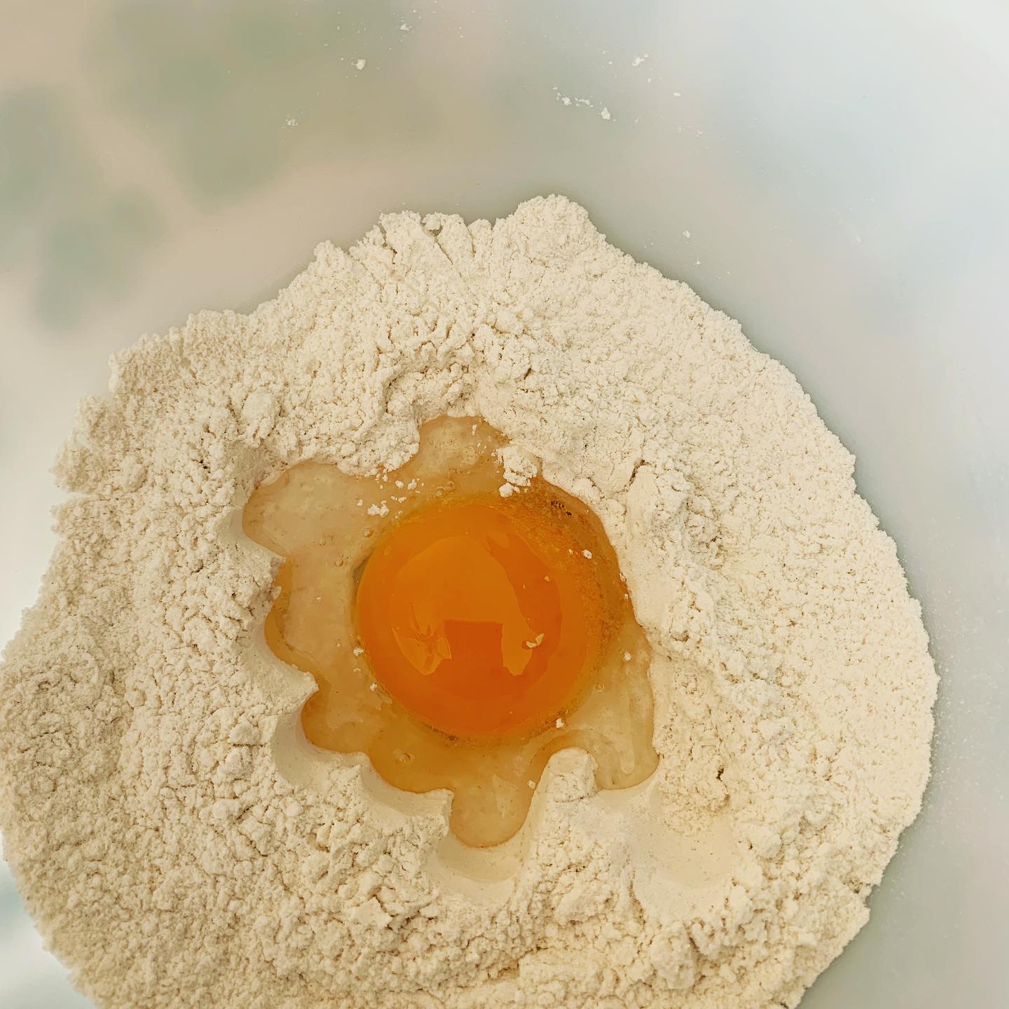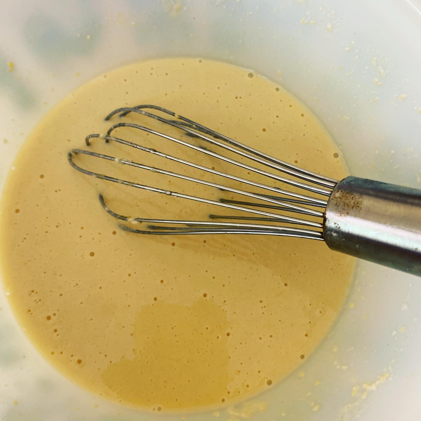 The recipe I found called for four eggs and I had one really large duck egg in my last delivery. I decided to halve the recipe and use just the single large duck egg in it, then adjust the quantity of milk. Look at that pretty yolk! You’ll notice a lot more yolk than white. So you can’t just substitute duck eggs for chicken eggs without making other adjustments to the recipe. The rule of thumb is one duck egg for two medium chicken eggs, and that might work for something like crêpes, but not necessarily in a fancy cake. I have a lot of experimenting to do!