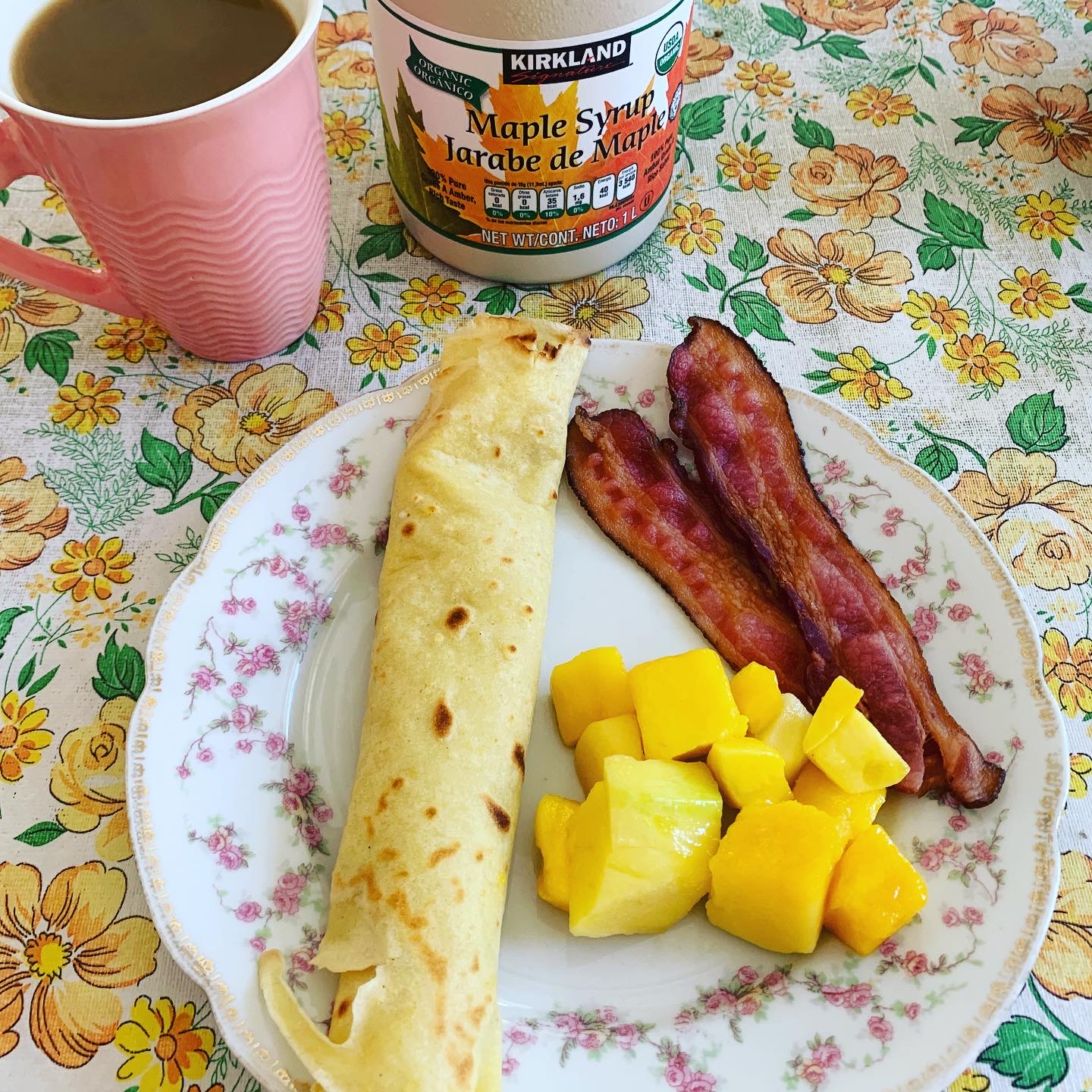 My mother usually makes her crêpes with buckwheat. My favourite addition to those are stewed prunes (🤷♀️), but I like maple syrup on regular crêpes. I treated myself to a container of it last time I was at Costco. I have not had maple syrup in eons. It’s one of those things that flows through my veins that’s a bit dangerous to have in the fridge. But boy was I glad to have it today!