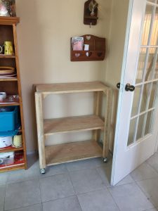 Needless to say, I couldn’t find anything available commercially at any price. I did come close with a cart I found that was the right height, but it was very shallow and narrow, with only one shelf and wire metal baskets underneath.