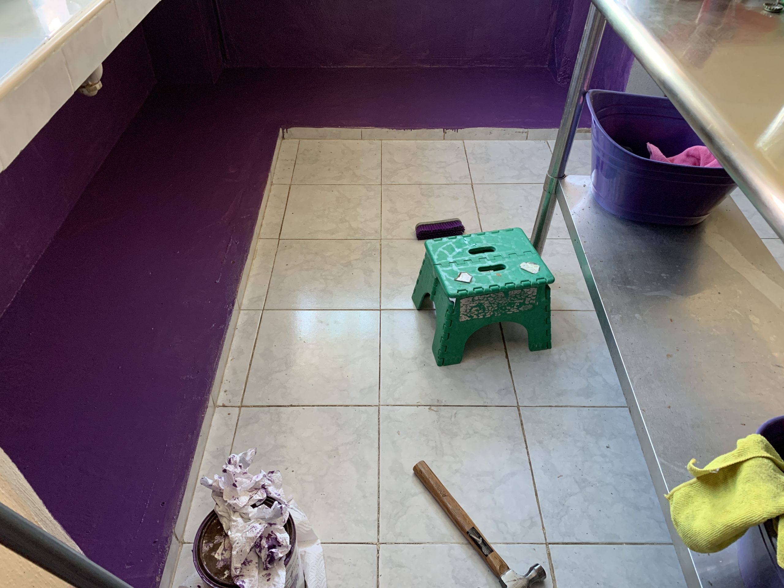 I managed to get in one coat of paint under the sink area today! I had bought this paint for a furniture refinishing project I gave up on. The paint was very expensive and I had barely used any of it, so I’m thrilled that I was able to put it to good use! This wasn’t on purpose, but I very nearly colour-matched the baskets under the steel island!