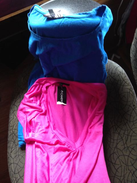 The first things I found were two tee-shirts. I really haven’t bought many clothes this summer because I didn’t need anything, but I have kept my eye out for tee-shirts. I buy cheap ones and rotate through them. I found two today that were colours I liked. The blue one has stitching on the sleeve that I’m not nuts about, but it’s otherwise in good condition and the colour is lovely. The pink one still has the original tag!