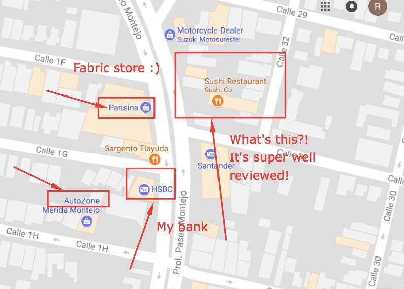 I worked at my first job of the day and then decided to go run some errands. I wanted Autozone for car wax because my sink is being too high maintenance (was told that a basic carnauba car wax would do the trick), HSBC for an ATM, and Parisina for fabric. As it turned out, Parisina is right by the HSBC. And look what’s across from it:
