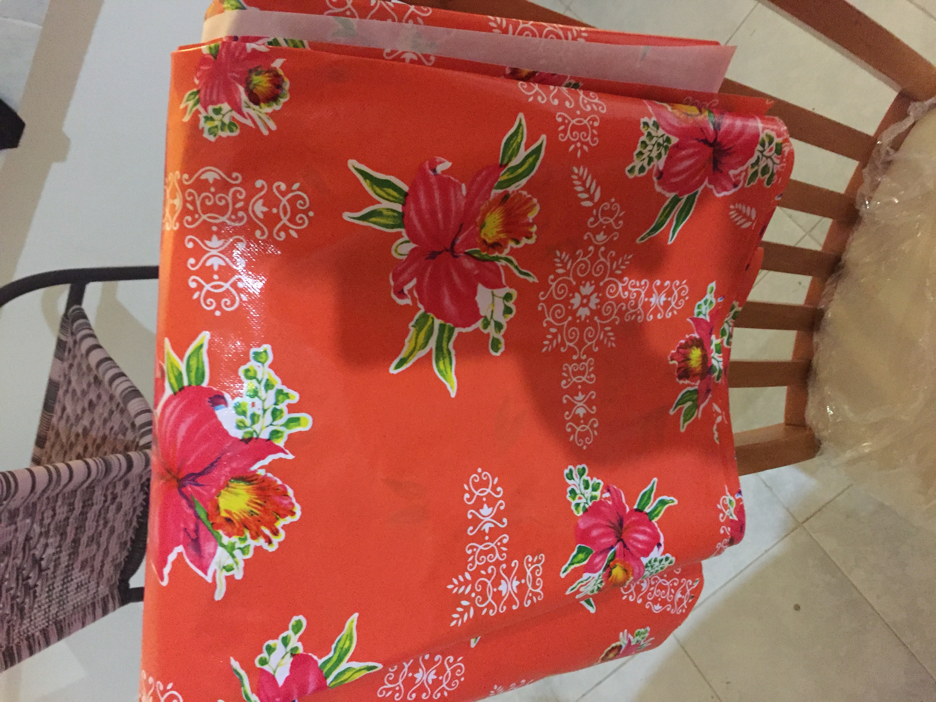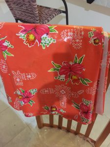 Parisina was after the bank. I wanted to price blackout material and also shelf liner. I had all my measurements for the shelves and what I wanted would have come close to $600! But then, I found some cloth-backed vinyl table cloths that would more than do the trick. Enough to do all my shelves was only $150! The patterns and colours were garish, even for my taste, but this was acceptable: