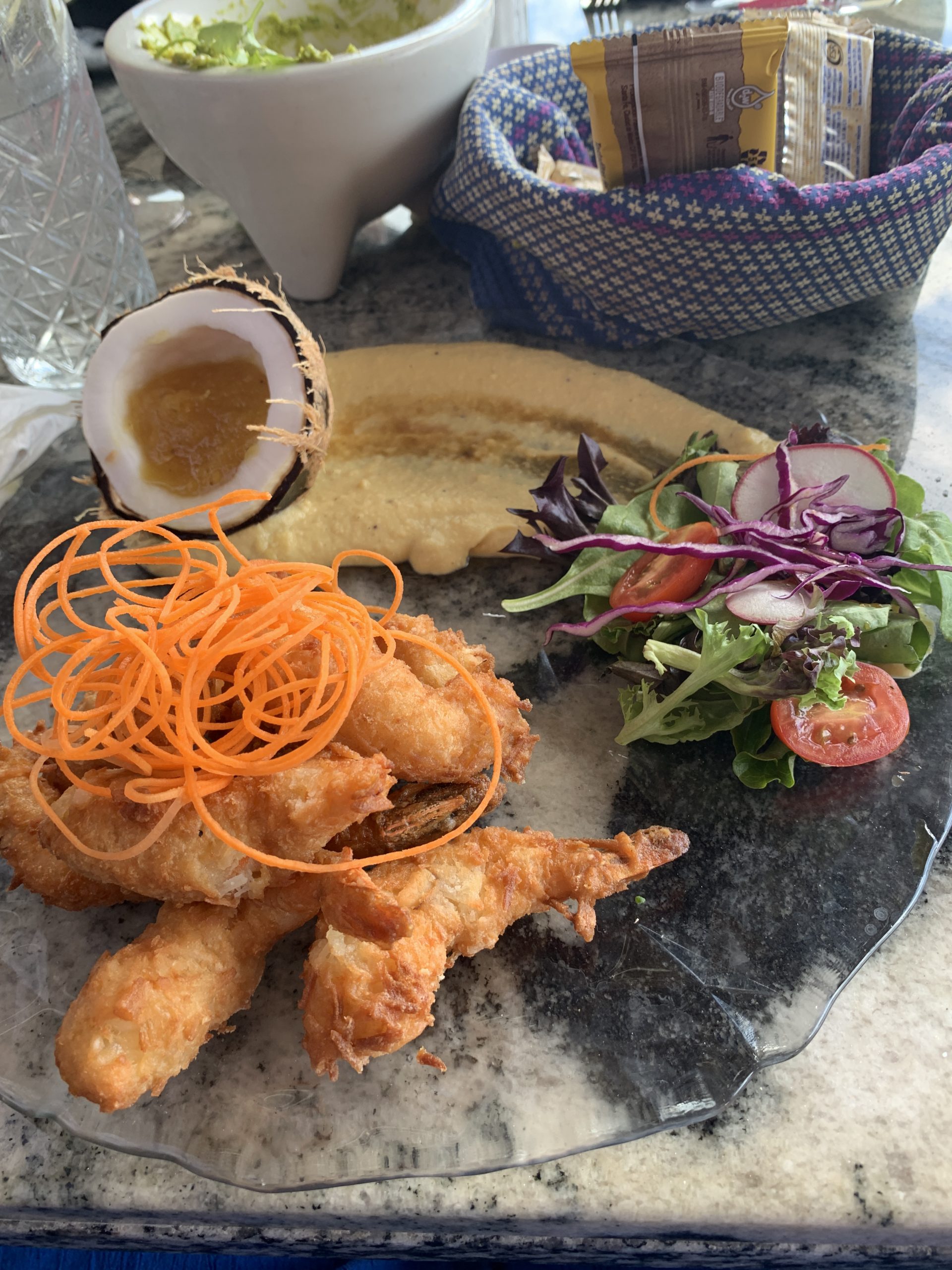 D and I both had the coconut shrimp and didn’t find it coconutty enough, but I found the pineapple habanero salsa and the plantain purée wonderful, and I don’t normally like plantains! Barely pictured are the dregs of our starter, guacamole with shrimp.