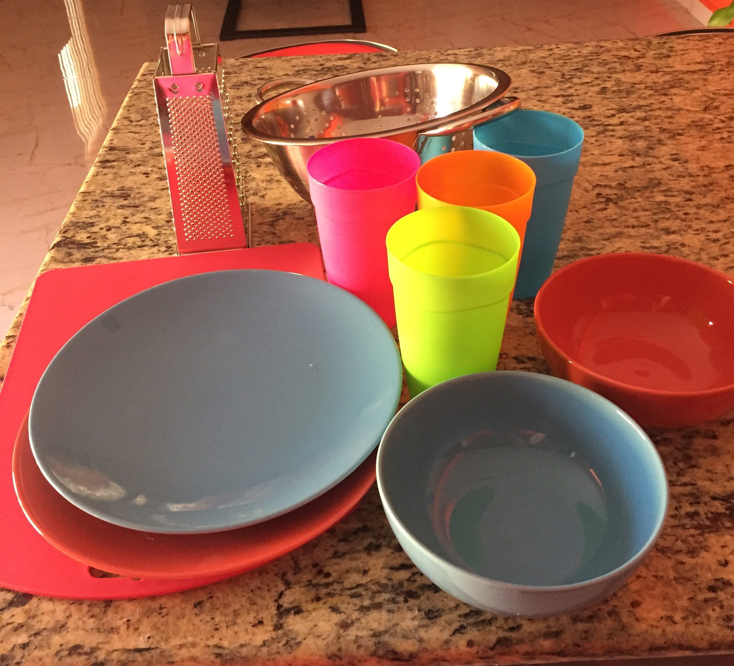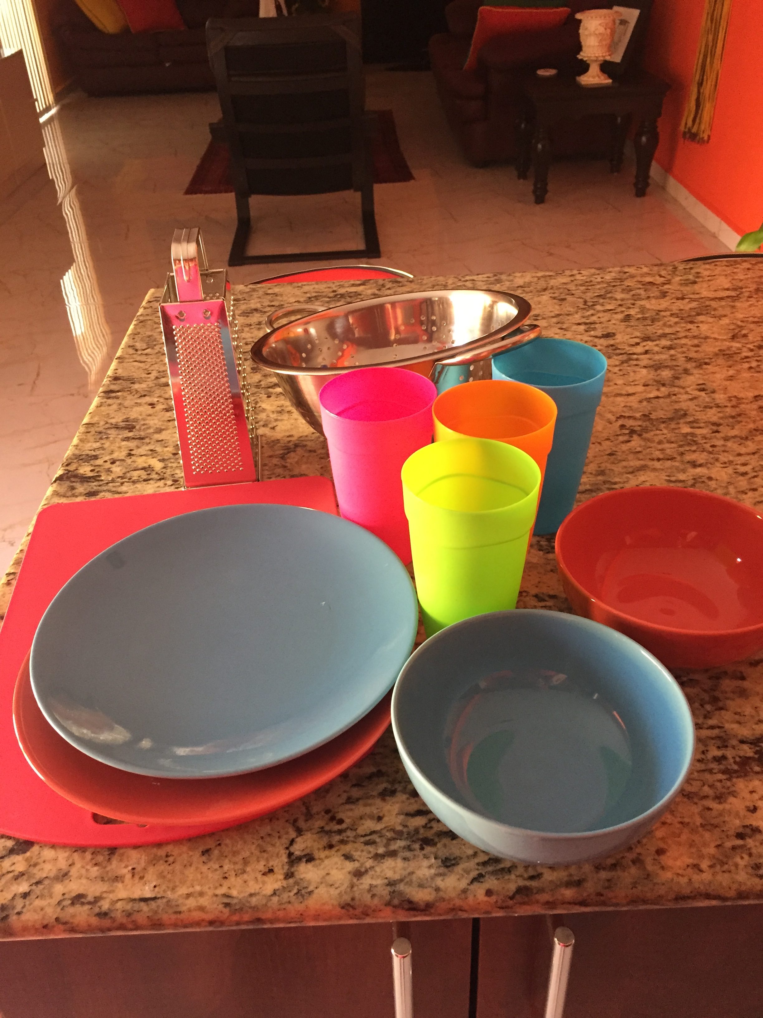 The lighting in here isn’t good, but you’ll just have to trust me that the coral and blue dishes look smashing together and much more vibrant in real life. 🙂 I can cut directly on the counter (as well as set down hot pots), but I figured a cutting board would help keep me containerised for easier sanitation purposes. I love its pretty pink colour. It’s so easy to find colourful things in Mexico, and often in many hues and shades, so you can get nice dark roses and corals instead of just baby and hot pink!