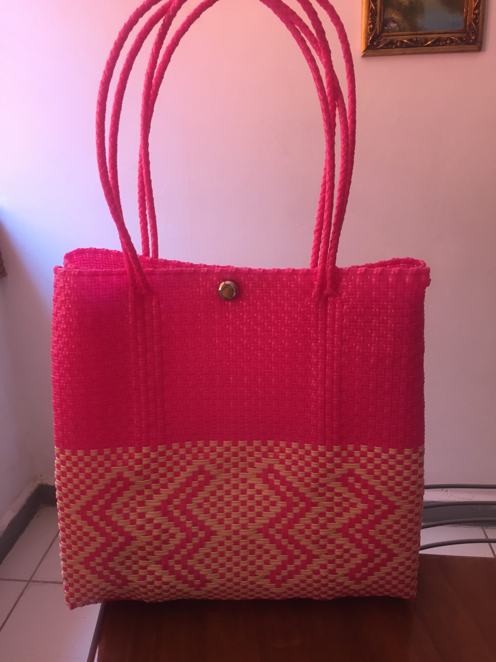 I spotted this one because of the colour and appreciated the double handles and the clasps. The saleslady was not impressed by my eyeing a pink one when I was in a pink skirt with a pink purse, so she tried to talk me into another colour (LOL!). She spent so much time with me that I knew I was going to buy from her even if I wasn’t really ready to buy as I hadn’t yet priced these bags. She told me the price was 200 pesos, and that was her best price “for me.” That seemed a bit steep, but, again, I hadn’t priced these yet and this was a large one with the three clasps and double handles, so it seemed possibly reasonable. The fact that the price was firm said a lot as well. So off I went with my tote!