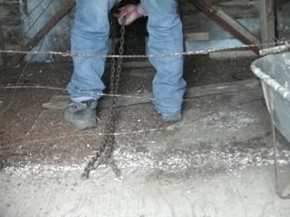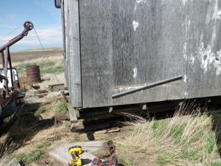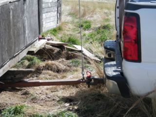 The larger grainery was on skids, but the middle skid, the one the hitch is supposed to attach to, was too wide! J got under there with a chainsaw and shaved the extra width off! After that, it was fairly quick going to get it loaded. I could tell that J and Charles fading fast.