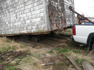 The guy who moves graineries, J, has done hundreds of these. In a best case scenario, which is about 95% of the time, he just winches the graineries up, slides a dolly onto the rear of the side skids, attaches a hitch to the middle skid, hooks the hitch up to his truck, and away he goes. Average time from arrival on site to departure: 20 minutes.