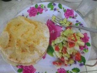 My food stores are getting a little low, but I’ll be fine through to Monday since I have all that lovely melty cheese and produce. Brunch this morning was a quesadilla with… salad? Guacamole? Salsa fresca? Dunno. Avocado plus onion plus tomato plus lime juice plus salt. I wound up eating the whole bowl of it, about twice what you see in this picture. I’d been up for four hours and was hungry! 🙂