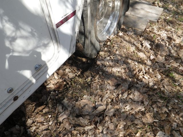 Can you see how deep the rear wheel is? The other side isn’t as bad and the front is on cement, so I’m confident a stomp on the gas pedal will get me out. I’m waiting till I can get some plywood to put under the wheels before I try to move again.