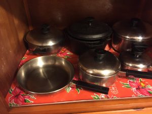 Ah, my pots and pans — the three in the front row and the big one at the back right, received as my Christmas present in ’97 before I moved out the following August. I started cooking tofu in these and finally graduated to meat! They are Meyer brand and evidence that if you take good care of your cookware, it will last a lifetime. Meyer doesn’t have a lifetime warranty, but when the handle on the medium-size pot (front centre) got really loose a few years ago and tightening the screw wasn’t doing anything anymore, I contacted Meyer since, to my surprise, I was only a couple of years out of warranty. They sent me a new handle, free of charge.
