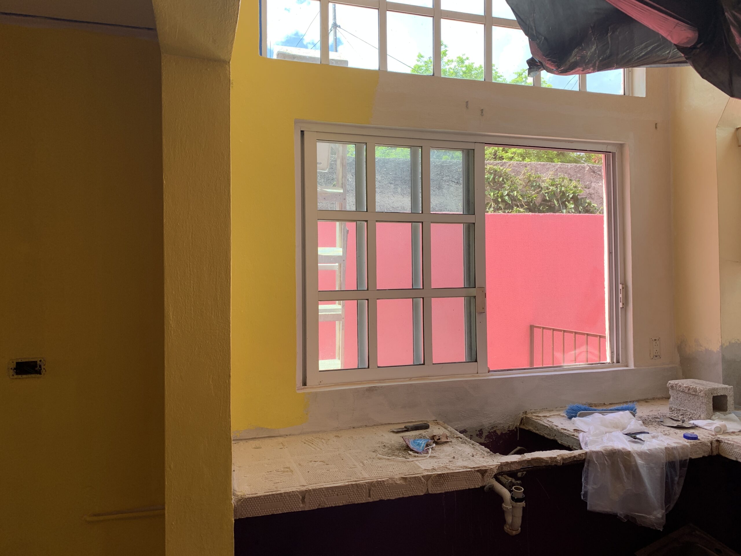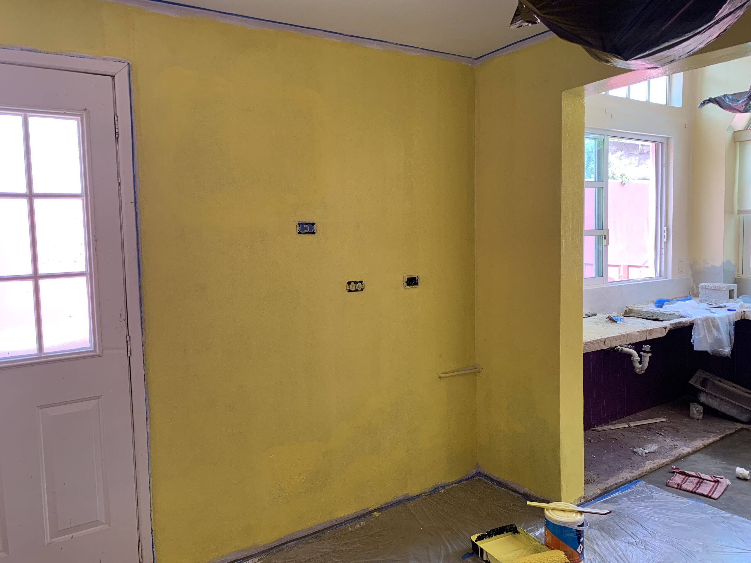 Thursday was a painting day! My contractor showed up a bit later than expected (with a heads-up) because he was out buying supplies, but he made up for that by staying a bit later. He used tape, drop cloths, and primer, all firsts. The primer really was a must with the uneven colours and finishes we were starting with. The back part of the room that I painted with the washable paint is proving to be a beast to cover, but he’s working steadily. This morning, he explained his methodology of getting something on that part of the kitchen and then moving to the front part of the room so he can give the back part extra time to dry.