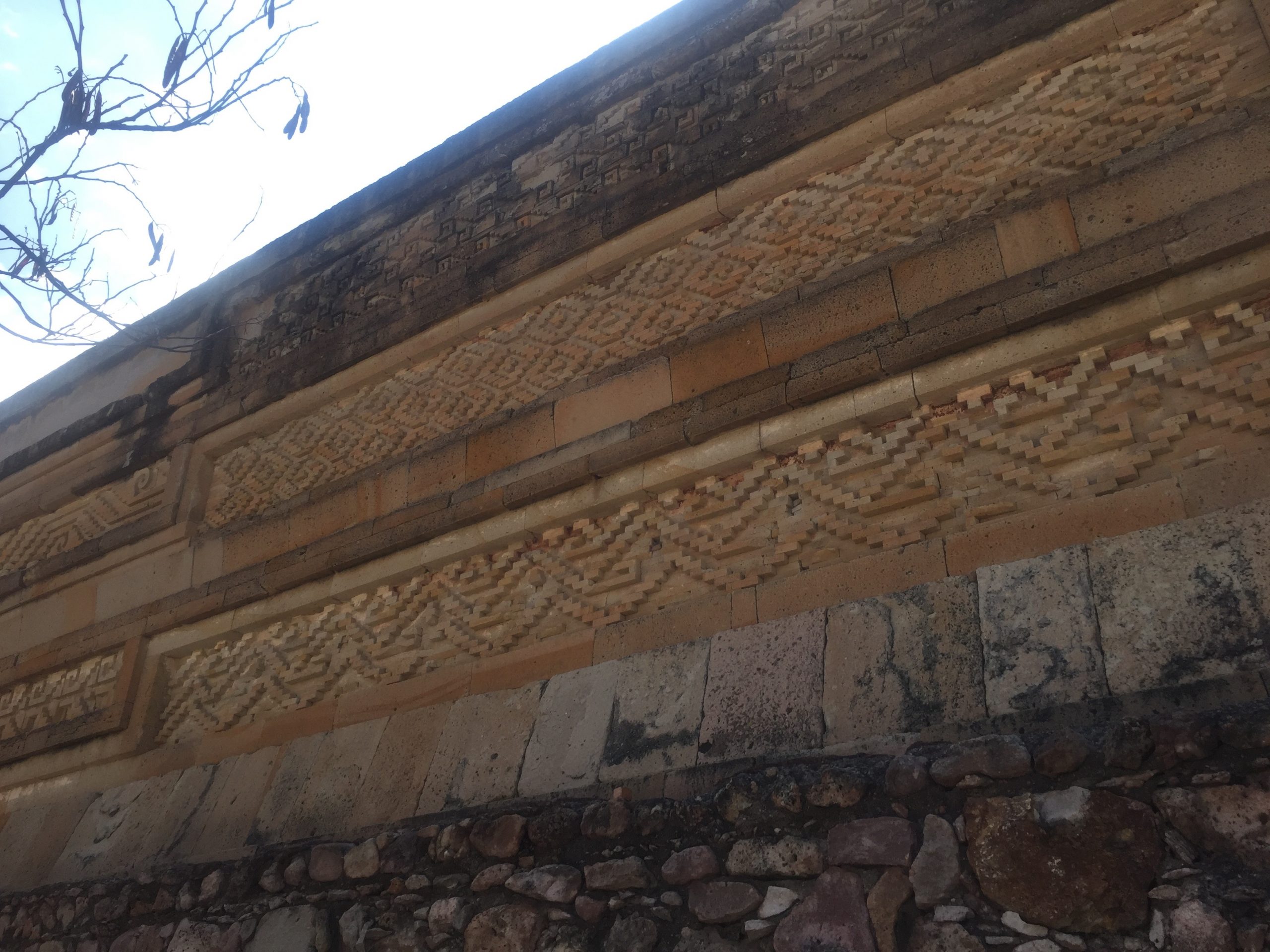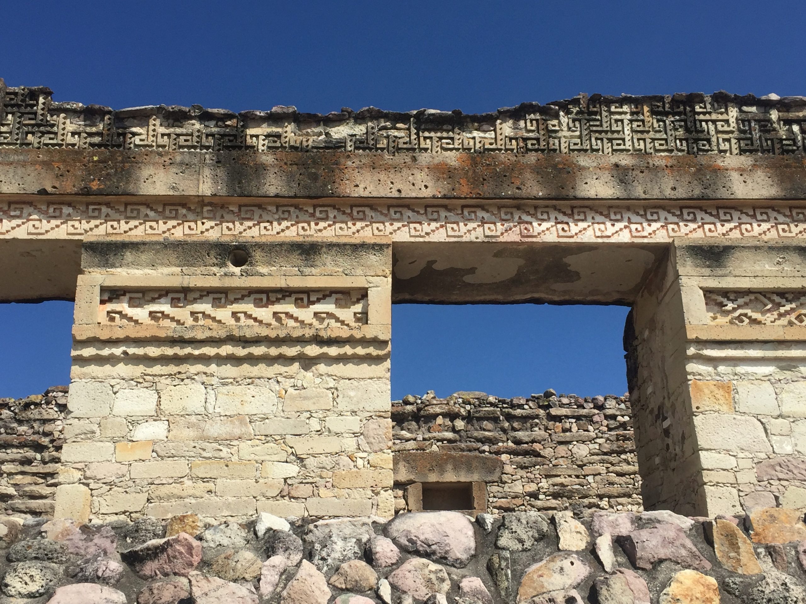 Mitla is known for its mosaics, but not mosaics like I was expecting. They are made of tiny bits of stone that just fit together with no mortar and from a distance look like fancy brickwork.