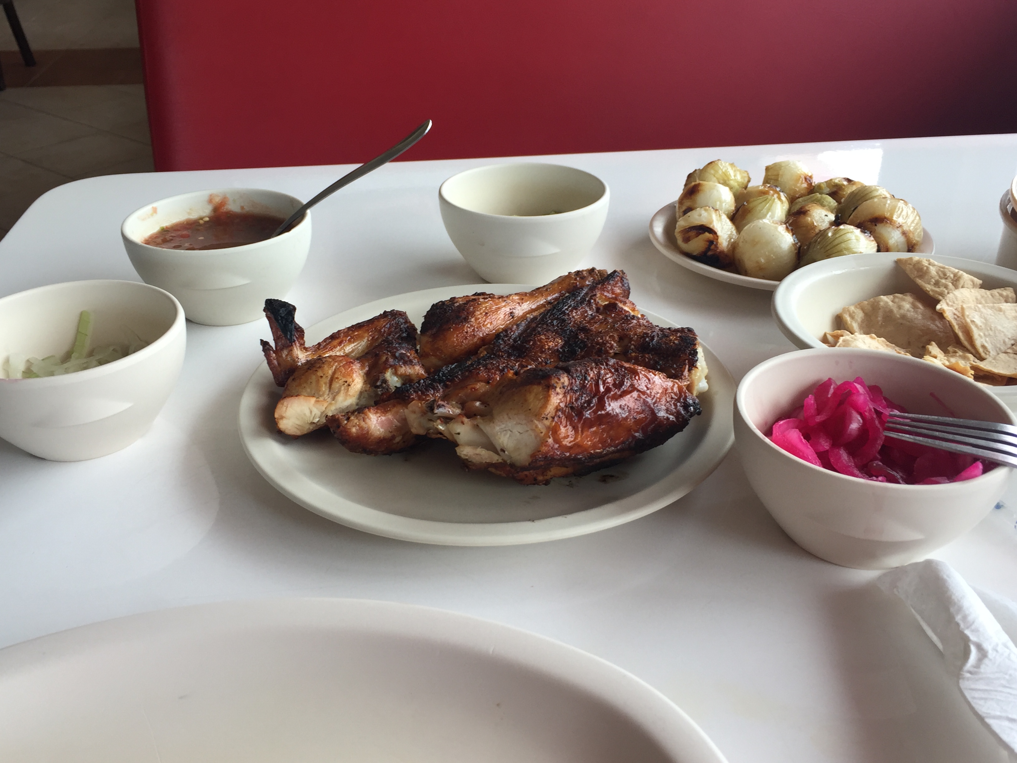 I got to Pollo Feliz and was surprised to see that it is both a proper sit down restaurant and a takeaway stand — it’s the Mexican Nando’s! I chose to eat in since I was famished. A half chicken was about $75. The server said it didn’t come with anything, but there were already totopos, salsa, two kinds of onions, and tortillas on the table so I declined a side. He rather pushed and I decided to try “cebollitas,” which, based on the grocery store, I expected to be be green onions.